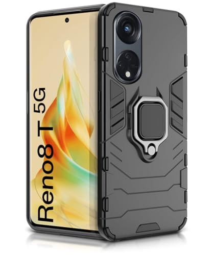 kelpuj Shock Proof Back Case Mobile Cover for Oppo Reno8 T | Reno 8T 5G | Back Cover Case (Tough Armor | Hybrid PC + TPU | Ring Holder & in-Built Kickstand | Black)
