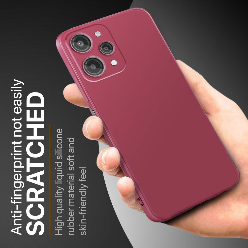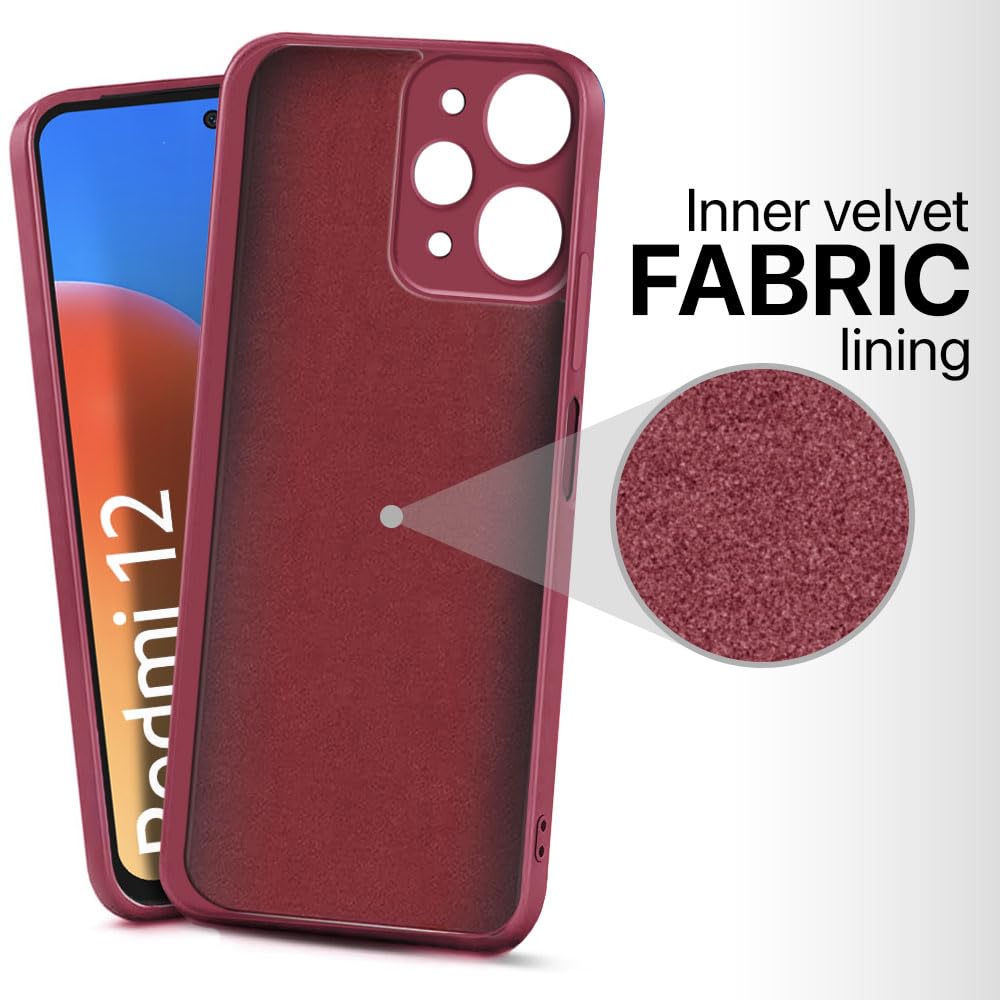 Back Cover for Mi Redmi 12 4G | Ultra Slim Soft Rubberised Case | Inner Velvet Fabric Lining | Matte Silicone Flexible Mobile Case | Camera Protection – Maroon Wine Red