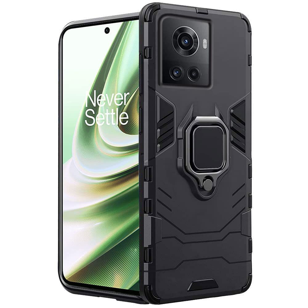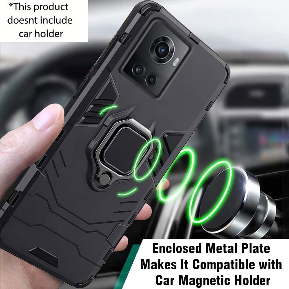 kelpuj Shock Proof Back Case Cover for 1+ OnePlus 10R 5G | 10R Prime 5G (Armor | Hybrid PC + TPU | Full Protection with Ring Holder Kickstand | Carbon Black)