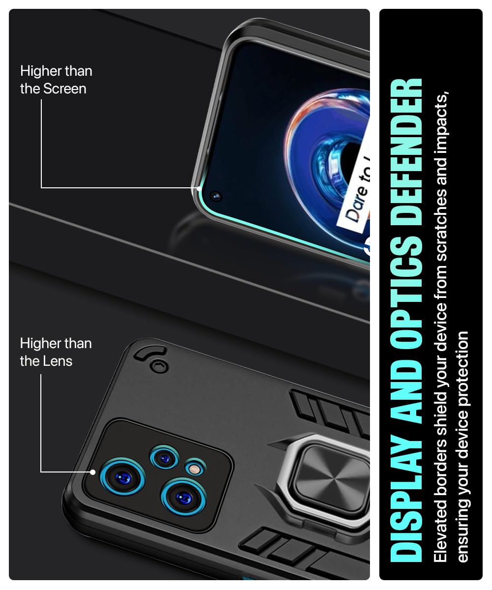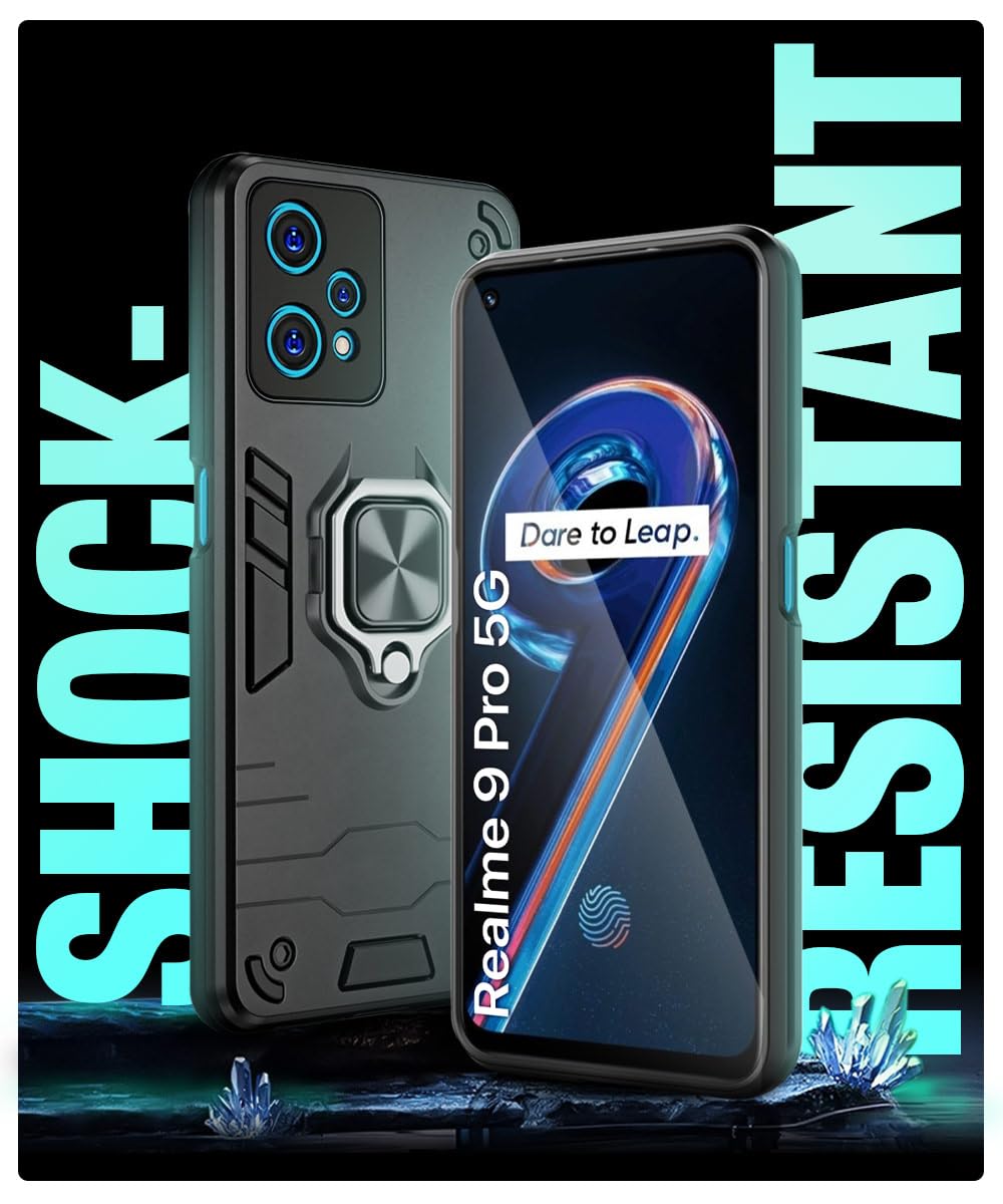kelpuj Shock Proof Back Case Mobile Cover for Realme 9 Pro 5G | Bumper Back Cover Case (Tough Armor | Hybrid PC + TPU | Full Protection with Ring Holder & in-Built Kickstand | Black)