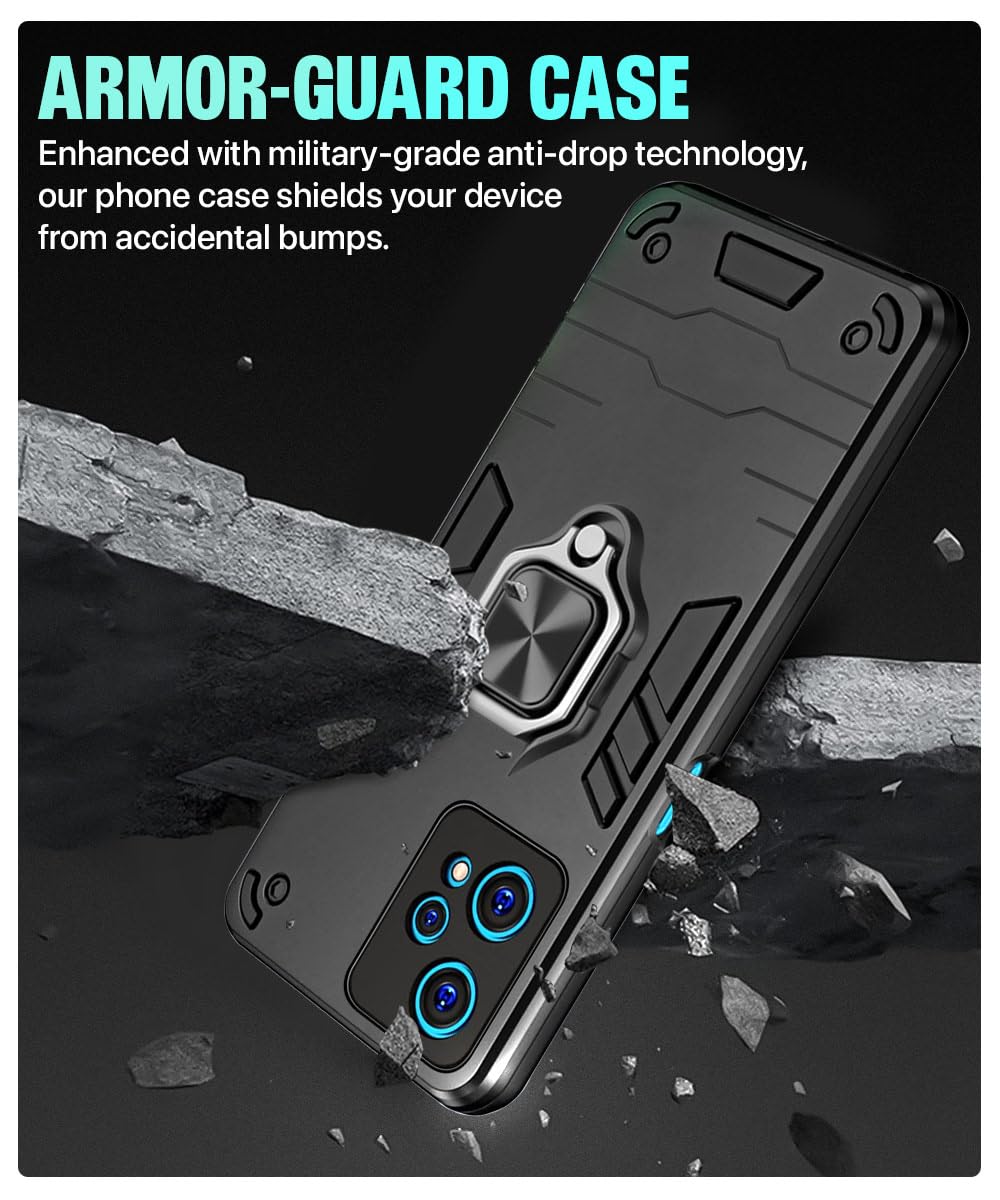 Shock Proof Back Case Mobile Cover for Realme 9 Pro 5G | Bumper Back Cover Case (Tough Armor | Hybrid PC + TPU | Full Protection with Ring Holder & in-Built Kickstand | Black) is designed with premium quality materials to provide superior protection, durability, and style for your smartphone. It offers a perfect balance between functionality and aesthetics, ensuring your device stays safe from scratches, impacts, and daily wear. Engineered with precision, it features accurate cutouts for ports, buttons, and cameras, making it highly convenient for everyday use. The slim and lightweight design ensures that your device retains its sleek profile without adding unnecessary bulk. Whether it is a nano film tempered glass, a hybrid back case, or a camera lens protector, each product is created with attention to detail to enhance the user experience and extend the life of your smartphone. The material used ensures long-lasting clarity, anti-scratch performance, and resistance against fingerprints and smudges. It is the ideal choice for users who want both style and substance in their smartphone accessories. This product from KELPUJ reflects innovation and craftsmanship, making it a reliable accessory that safeguards your investment while maintaining modern appeal.