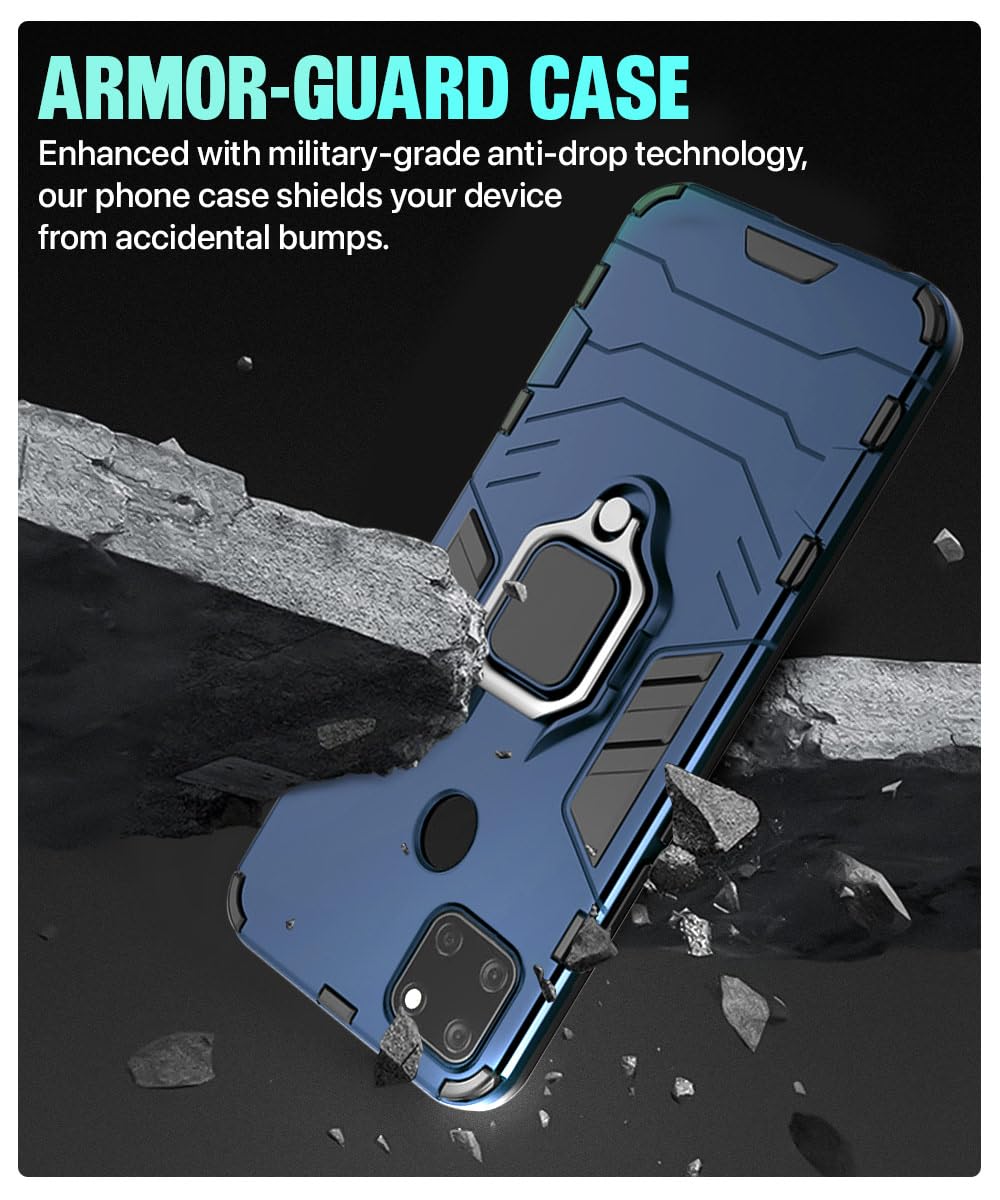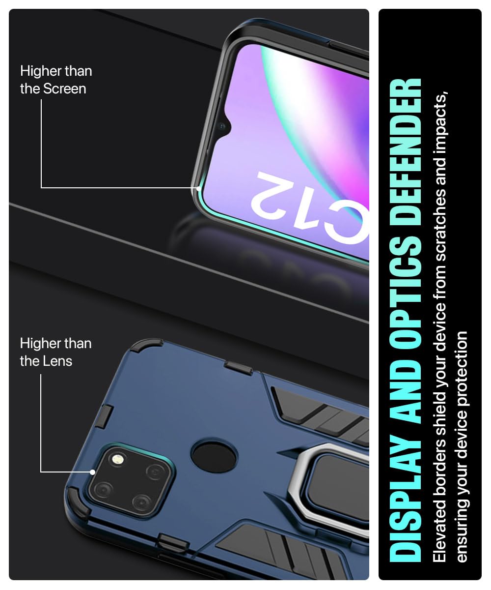 Shock Proof Back Case Mobile Cover for Realme Narzo 30A | 20 | C12 | Back Cover Case (Tough Armor | Hybrid PC + TPU | Ring Holder & in-Built Kickstand | Blue) is designed with premium quality materials to provide superior protection, durability, and style for your smartphone. It offers a perfect balance between functionality and aesthetics, ensuring your device stays safe from scratches, impacts, and daily wear. Engineered with precision, it features accurate cutouts for ports, buttons, and cameras, making it highly convenient for everyday use. The slim and lightweight design ensures that your device retains its sleek profile without adding unnecessary bulk. Whether it is a nano film tempered glass, a hybrid back case, or a camera lens protector, each product is created with attention to detail to enhance the user experience and extend the life of your smartphone. The material used ensures long-lasting clarity, anti-scratch performance, and resistance against fingerprints and smudges. It is the ideal choice for users who want both style and substance in their smartphone accessories. This product from KELPUJ reflects innovation and craftsmanship, making it a reliable accessory that safeguards your investment while maintaining modern appeal.