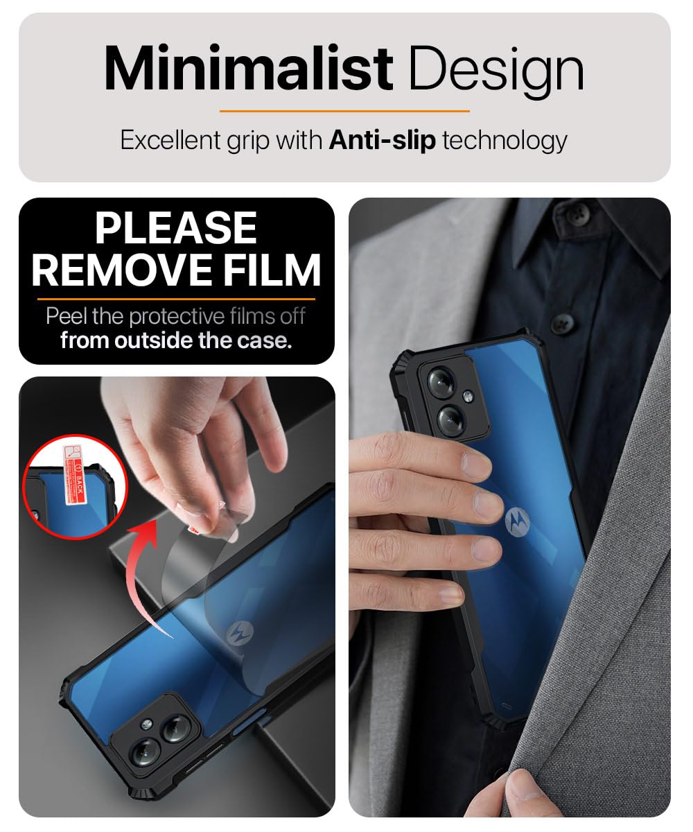 Shock Proof Clear Protective Back Case for Motorola Moto G14 – AirEDGE Technology | 360 Degree Camera Protection | Transparent Hybrid Back Case Mobile Cover – Black is designed with premium quality materials to provide superior protection, durability, and style for your smartphone. It offers a perfect balance between functionality and aesthetics, ensuring your device stays safe from scratches, impacts, and daily wear. Engineered with precision, it features accurate cutouts for ports, buttons, and cameras, making it highly convenient for everyday use. The slim and lightweight design ensures that your device retains its sleek profile without adding unnecessary bulk. Whether it is a nano film tempered glass, a hybrid back case, or a camera lens protector, each product is created with attention to detail to enhance the user experience and extend the life of your smartphone. The material used ensures long-lasting clarity, anti-scratch performance, and resistance against fingerprints and smudges. It is the ideal choice for users who want both style and substance in their smartphone accessories. This product from KELPUJ reflects innovation and craftsmanship, making it a reliable accessory that safeguards your investment while maintaining modern appeal.