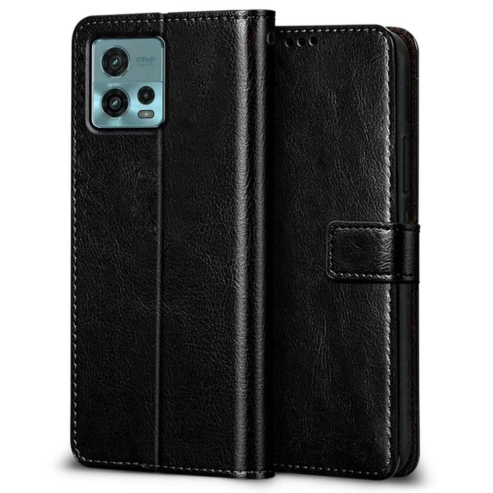 Buy premium shock proof flip cover back case for motorola moto g72. Leather finish with magnetic flip closure, wallet pockets and stand support. Durable protection against drops and scratches with a perfect fit for motorola moto g72.