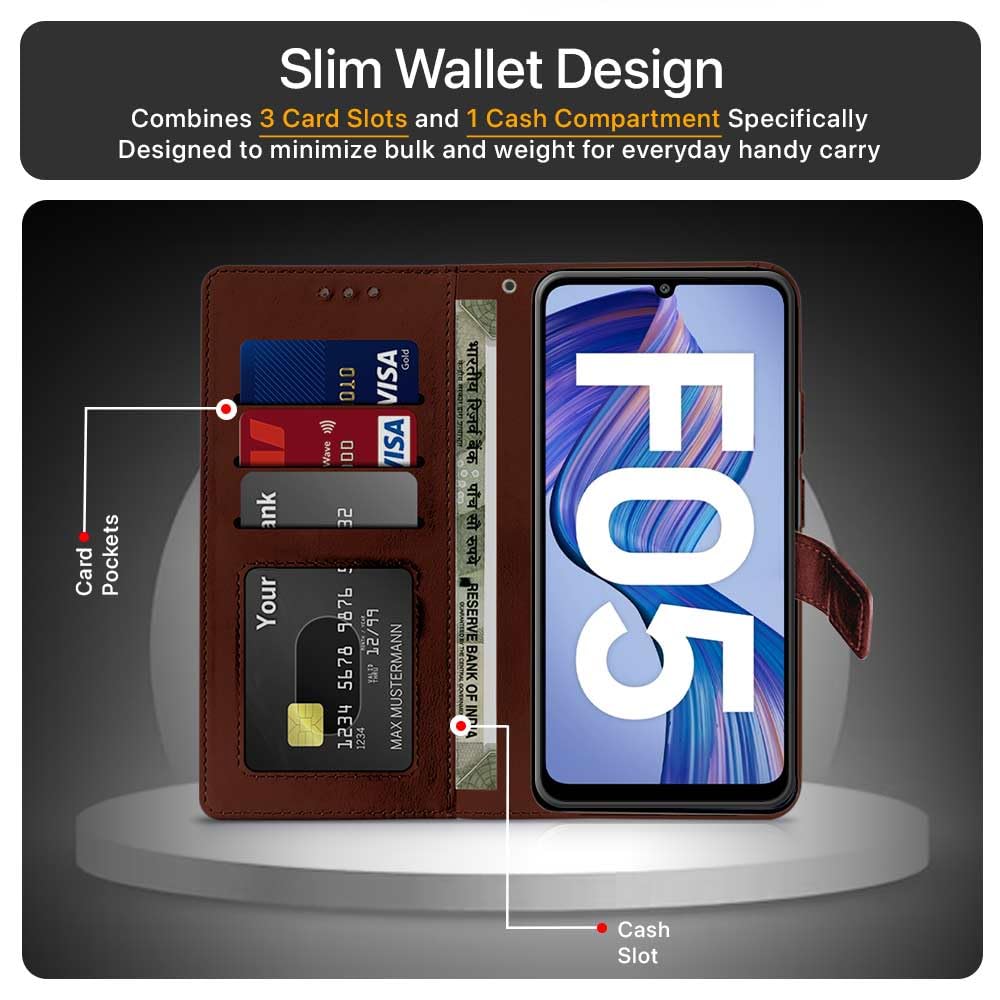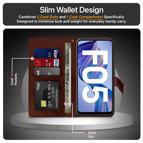 Shock Proof Flip Cover Back Case for Samsung Galaxy F05 | Magnetic Wallet Leather Case with Stand