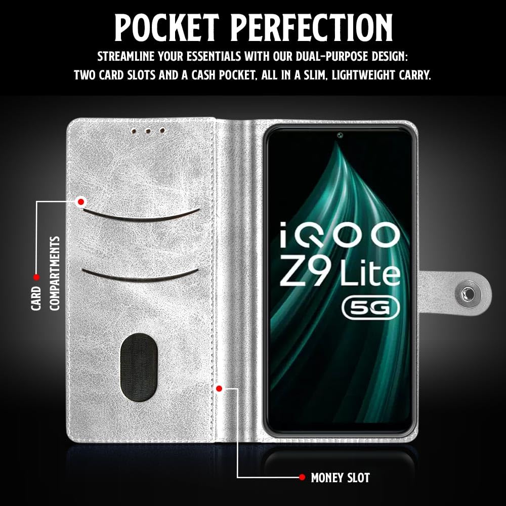Buy premium shock proof flip cover back case for iqoo z9 lite. Leather finish with magnetic flip closure, wallet pockets and stand support. Durable protection against drops and scratches with a perfect fit for iqoo z9 lite.