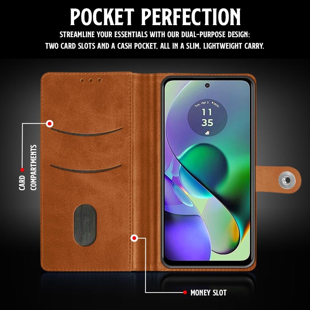 Buy premium shock proof flip cover back case for motorola moto g54 5g. Leather finish with magnetic flip closure, wallet pockets and stand support. Durable protection against drops and scratches with a perfect fit for motorola moto g54 5g.