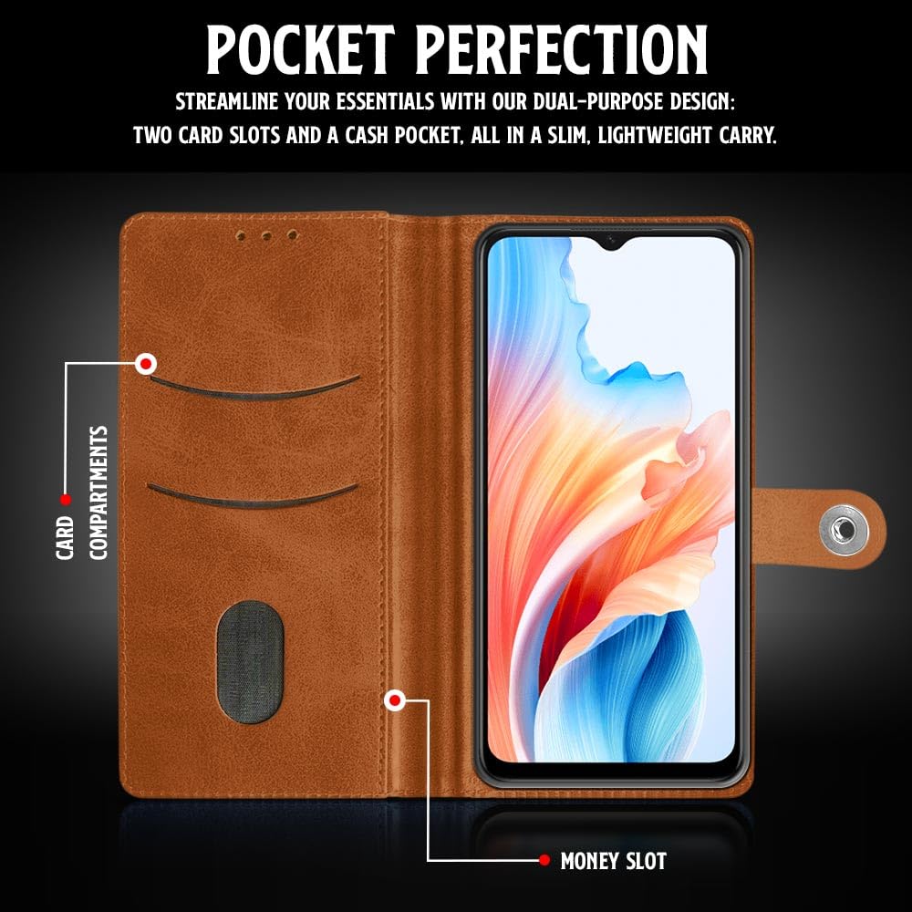 Buy premium shock proof flip cover back case for oppo a59 5g. Leather finish with magnetic flip closure, wallet pockets and stand support. Durable protection against drops and scratches with a perfect fit for oppo a59 5g.
