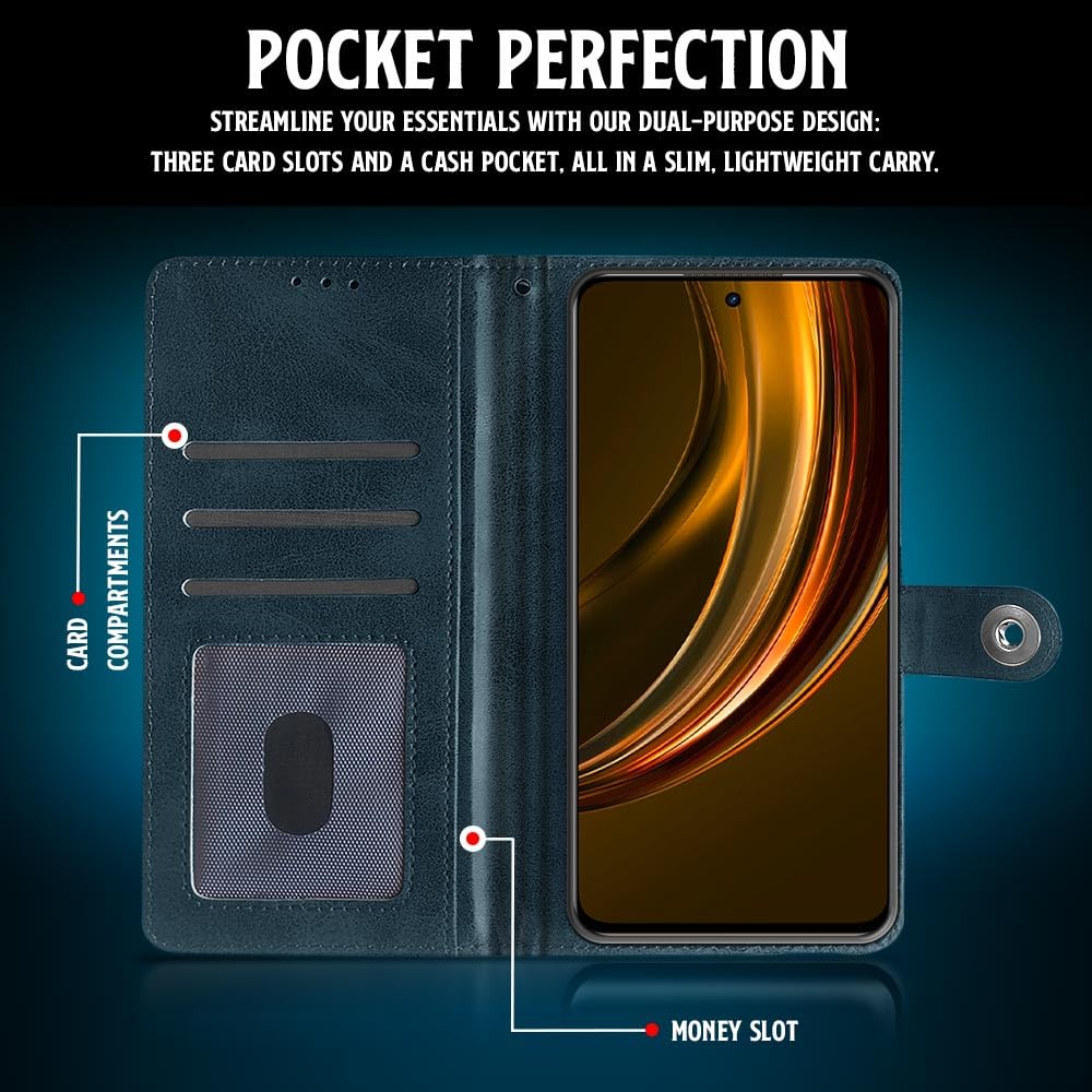 Buy premium shock proof flip cover back case for realme 13 plus 5g. Leather finish with magnetic flip closure, wallet pockets and stand support. Durable protection against drops and scratches with a perfect fit for realme 13 plus 5g.