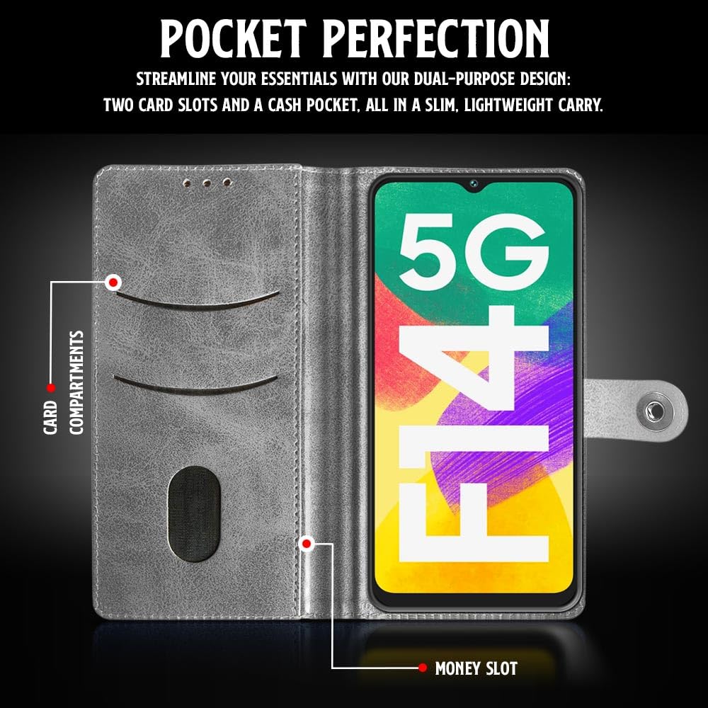 Shock Proof Flip Cover Back Case for Samsung Galaxy F14 5G | Magnetic Wallet Leather Case with Stand