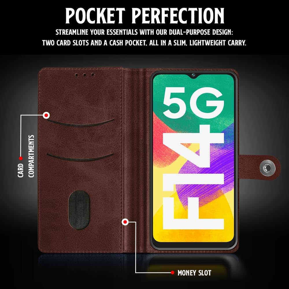 Buy premium shock proof flip cover back case for samsung galaxy f14 5g. Leather finish with magnetic flip closure, wallet pockets and stand support. Durable protection against drops and scratches with a perfect fit for samsung galaxy f14 5g.