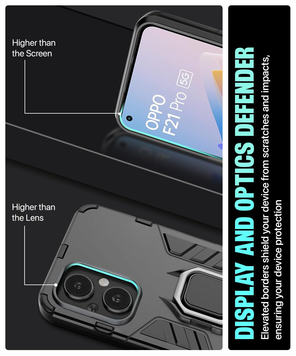 Polycarbonate Oppo F21 Pro 5G Tough Armor Bumper Back Case Cover for Mobile | Ring Holder & Kickstand in-Built | Excellent 360 Degree Protection (Carbon Black)