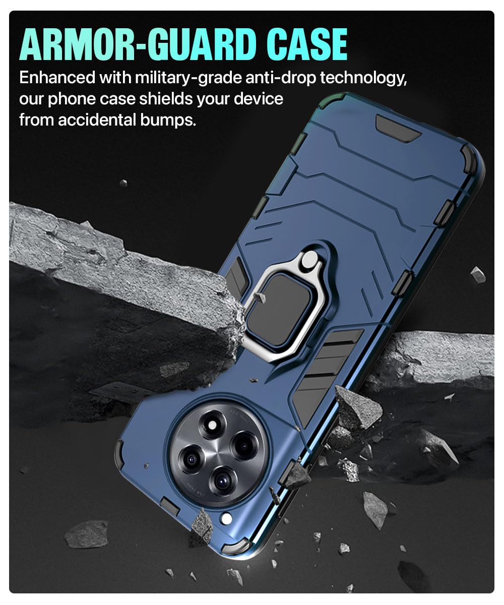 Shock Proof Back Case Mobile Cover for 1+ OnePlus 12R 5G | Back Cover Case (Tough Armor | Hybrid PC + TPU | Ring Holder & in-Built Kickstand | Blue)