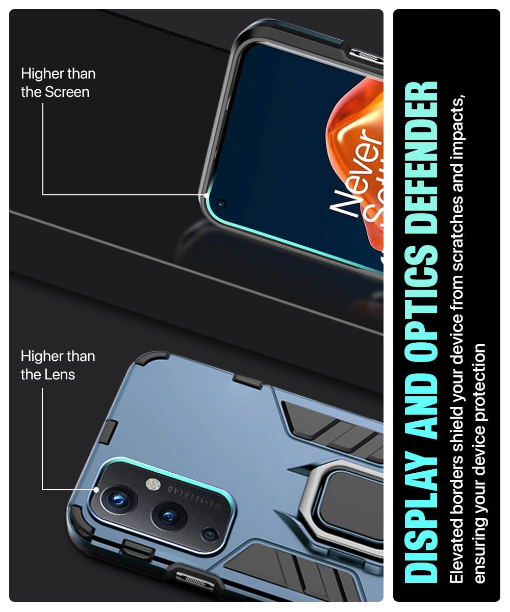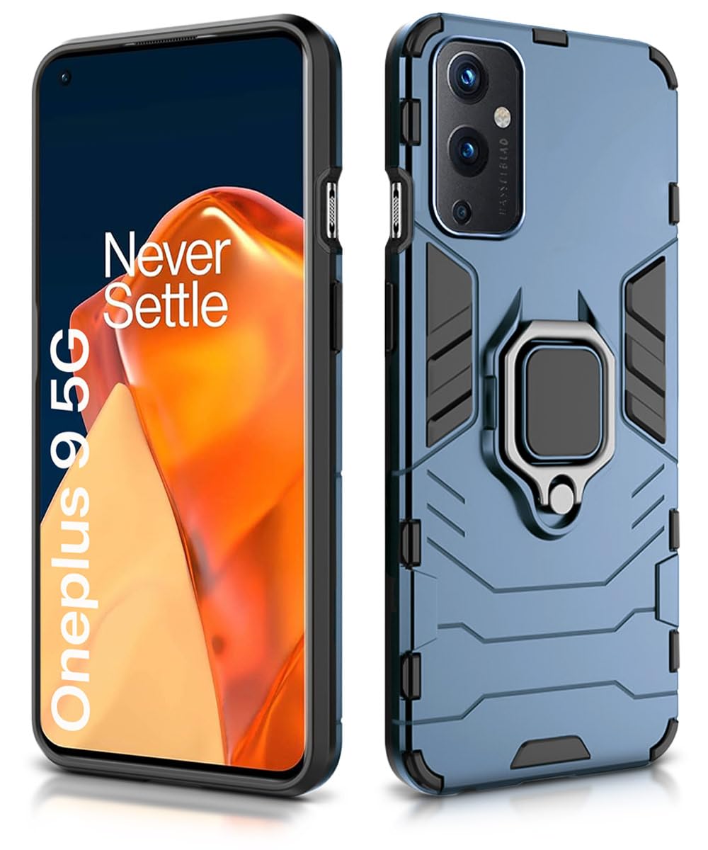 Shock Proof Back Case Mobile Cover for 1+ OnePlus 9 5G | Back Cover Case (Tough Armor | Hybrid PC + TPU | Ring Holder & in-Built Kickstand | Blue)