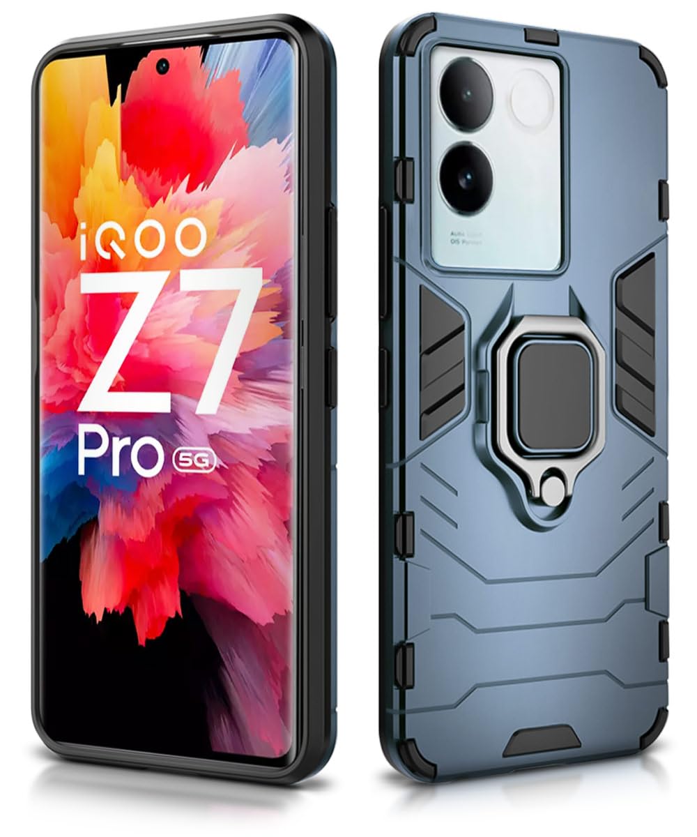 Shock Proof Back Case Mobile Cover for iQOO Z7 Pro | Vivo T2 Pro 5G | Back Cover Case (Tough Armor | Hybrid PC + TPU | Ring Holder & in-Built Kickstand | Blue)