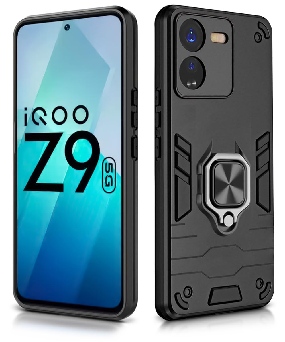 Shock Proof Back Case Mobile Cover for iQOO Z9 5G | Back Cover Case (Tough Armor | Hybrid PC + TPU | Ring Holder & in-Built Kickstand | Black)