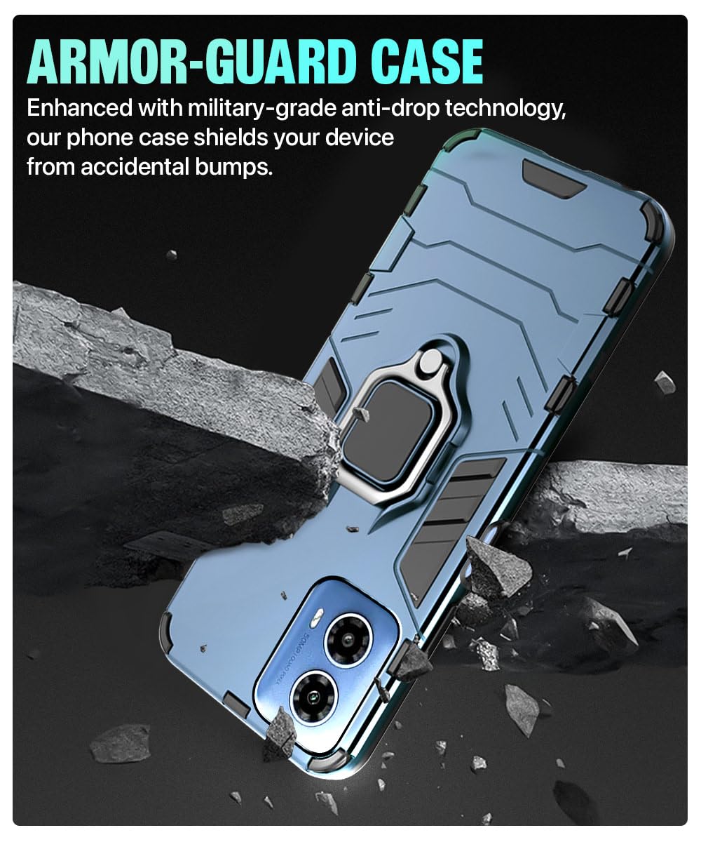 The Shock Proof Back Case Mobile Cover for Motorola Moto G34 5G | Moto G45 5G | Back Cover Case (Tough Armor | Hybrid PC + TPU | Ring Holder & in-Built Kickstand | Blue) is designed with premium quality materials to provide superior protection, durability, and style for your smartphone. It offers a perfect balance between functionality and aesthetics, ensuring your device stays safe from scratches, impacts, and daily wear. Engineered with precision, it features accurate cutouts for ports, buttons, and cameras, making it highly convenient for everyday use. The slim and lightweight design ensures that your device retains its sleek profile without adding unnecessary bulk. Whether it is a nano film tempered glass, a hybrid back case, or a camera lens protector, each product is created with attention to detail to enhance the user experience and extend the life of your smartphone. The material used ensures long-lasting clarity, anti-scratch performance, and resistance against fingerprints and smudges. It is the ideal choice for users who want both style and substance in their smartphone accessories. This product from reflects innovation and craftsmanship, making it a reliable accessory that safeguards your investment while maintaining modern appeal.