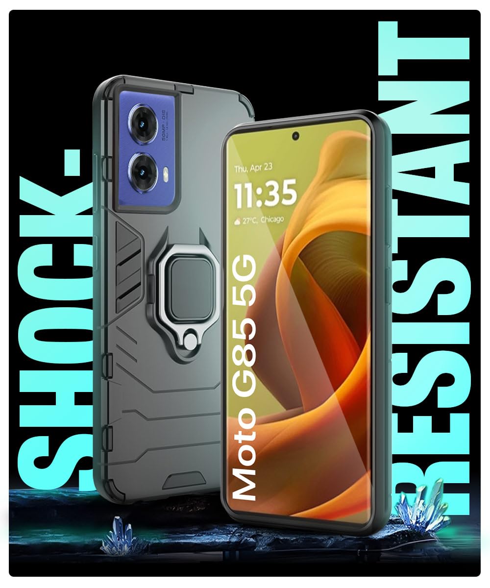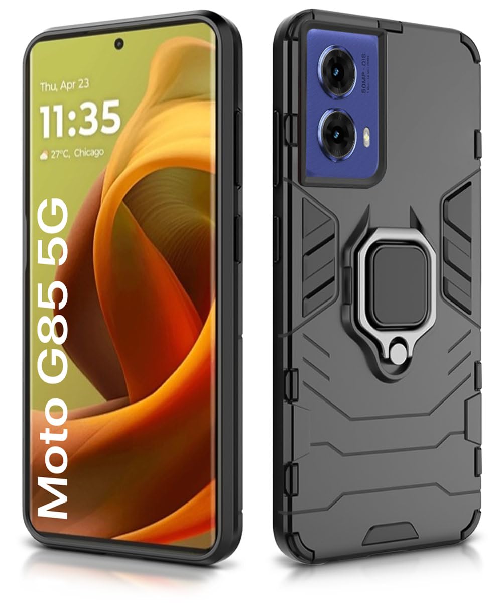 Shock Proof Back Case Mobile Cover for Motorola Moto G85 5G | Back Cover Case (Tough Armor | Hybrid PC + TPU | Ring Holder & in-Built Kickstand | Black)