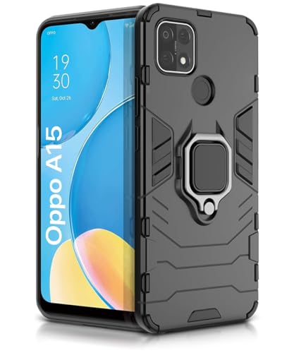 Shock Proof Back Case Mobile Cover for Oppo A15 | Oppo A15s (Armor | Hybrid PC + TPU | Full Protection with Ring Holder Kickstand | Carbon Black)