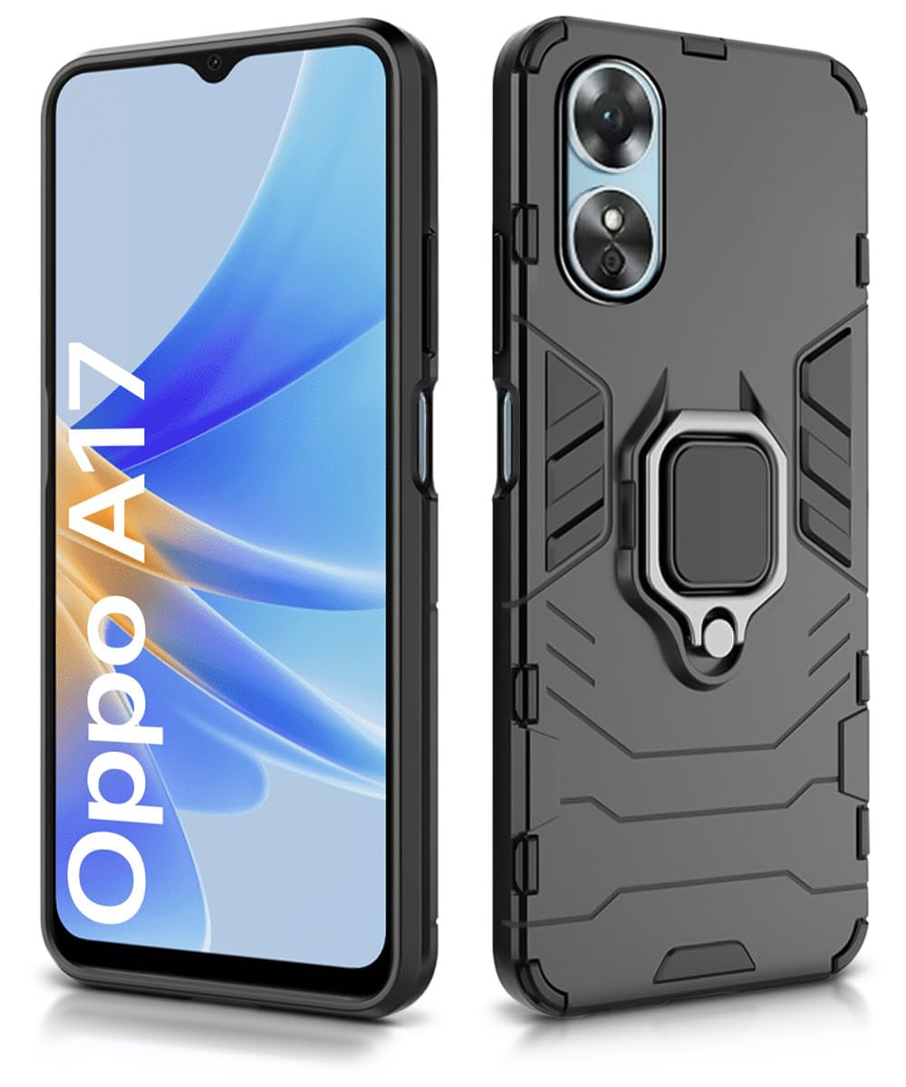 Shock Proof Back Case Mobile Cover for Oppo A17 | Back Cover Case (Tough Armor | Hybrid PC + TPU | Ring Holder & in-Built Kickstand | Black)