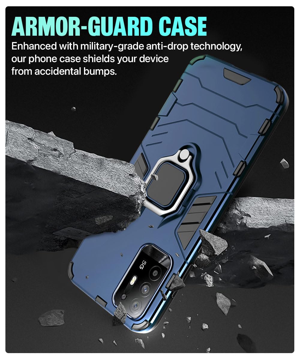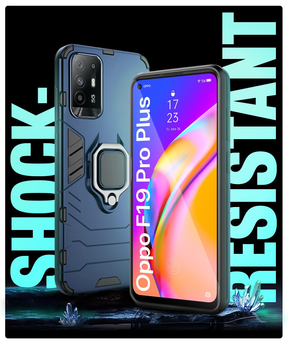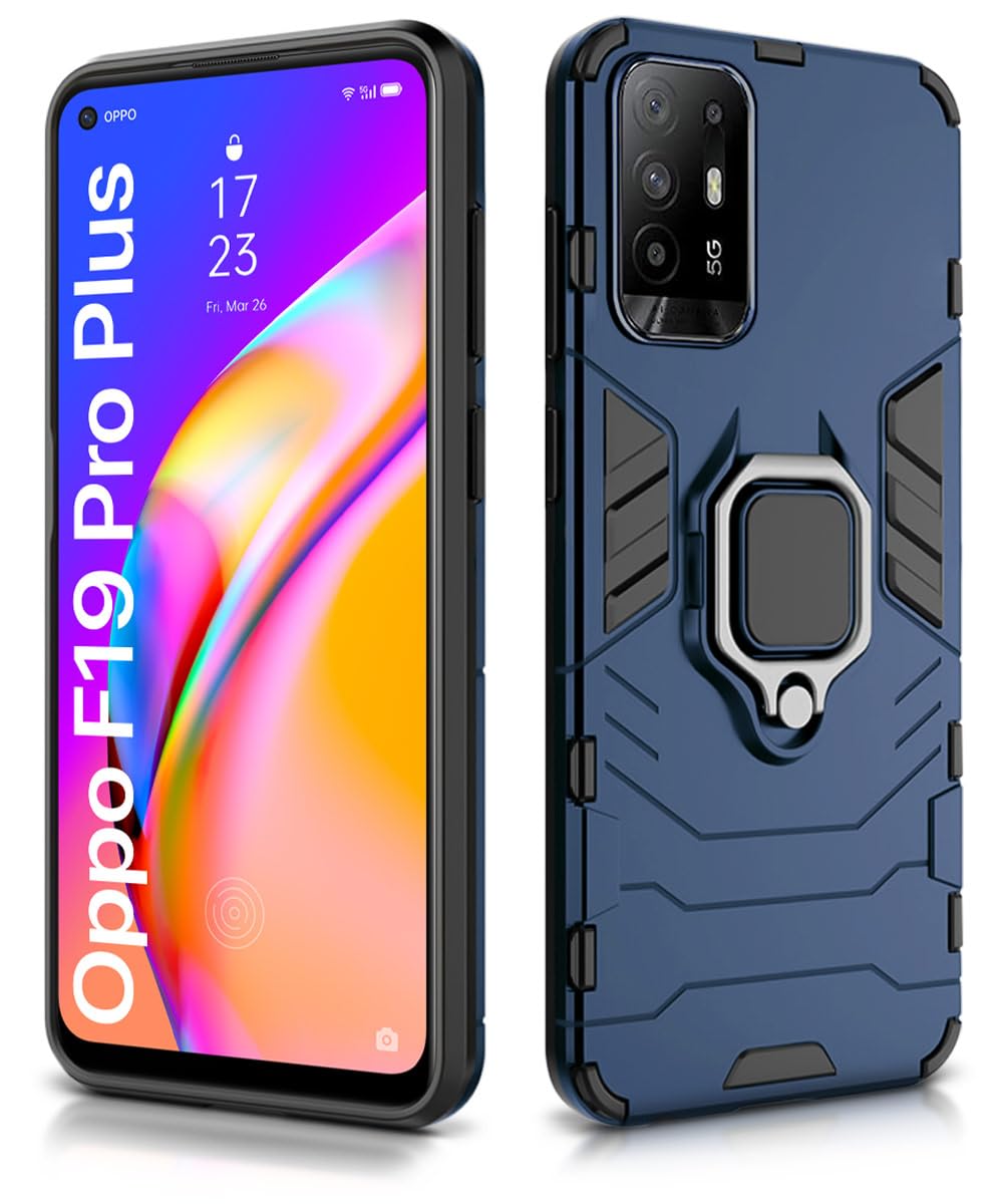 Shock Proof Back Case Mobile Cover for Oppo F19 Pro Plus | Back Cover Case (Tough Armor | Hybrid PC + TPU | Ring Holder & in-Built Kickstand | Blue)