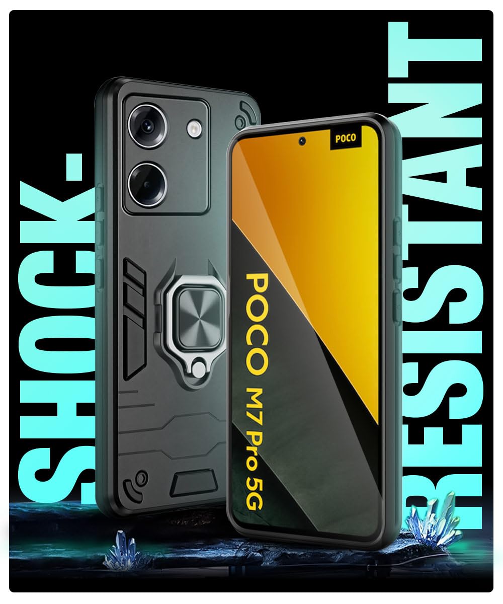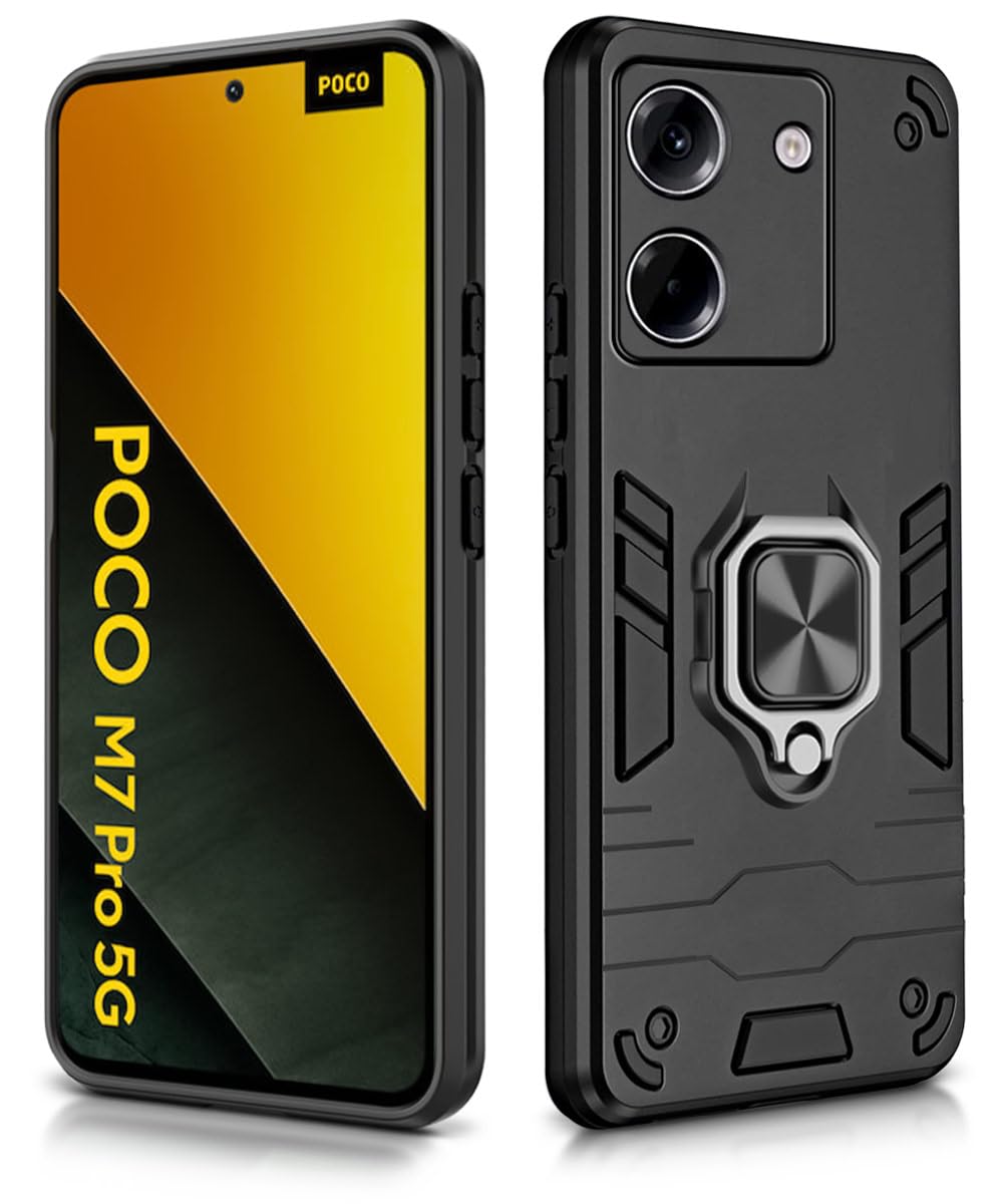 Shock Proof Back Case Mobile Cover for Poco M7 Pro 5G | Back Cover Case (Tough Armor | Hybrid PC + TPU | Ring Holder & in-Built Kickstand | Black)