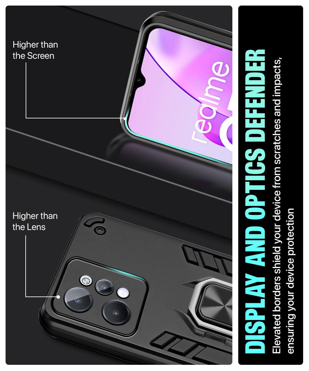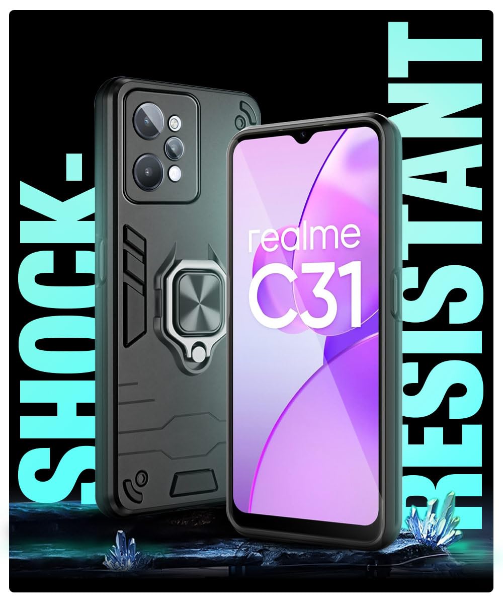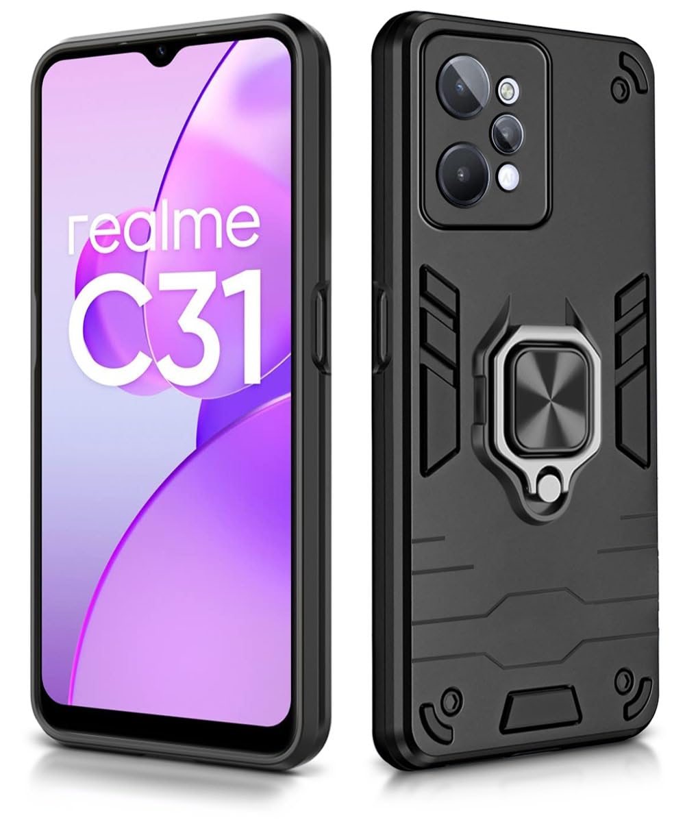 Shock Proof Back Case Mobile Cover for Realme C31 (Armor | Hybrid PC + TPU | Full Protection with Ring Holder Kickstand | Carbon Black)