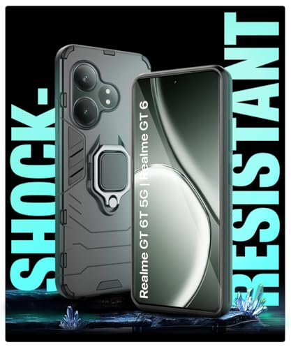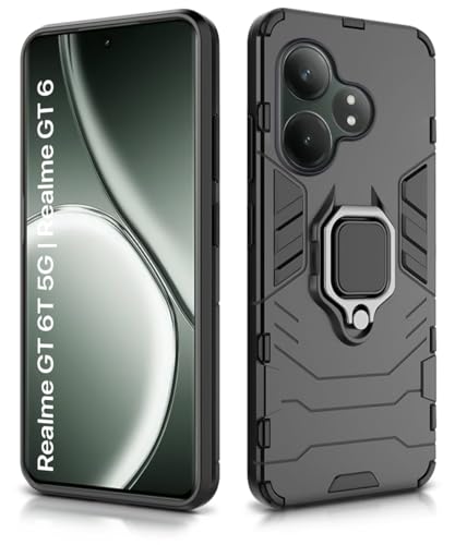 Shock Proof Back Case Mobile Cover for Realme GT 6T 5G | Realme GT 6 | Back Cover Case (Tough Armor | Hybrid PC + TPU | Ring Holder & in-Built Kickstand | Black)