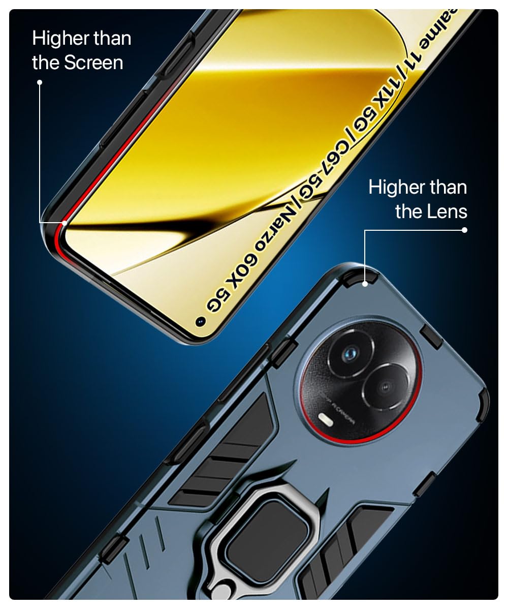 The Shock Proof Back Case Mobile Cover for Realme Narzo 60X 5G | 11 5G | 11X 5G | C67 5G | Back Cover Case (Tough Armor | Hybrid PC + TPU | Ring Holder & in-Built Kickstand | Blue) is designed with premium quality materials to provide superior protection, durability, and style for your smartphone. It offers a perfect balance between functionality and aesthetics, ensuring your device stays safe from scratches, impacts, and daily wear. Engineered with precision, it features accurate cutouts for ports, buttons, and cameras, making it highly convenient for everyday use. The slim and lightweight design ensures that your device retains its sleek profile without adding unnecessary bulk. Whether it is a nano film tempered glass, a hybrid back case, or a camera lens protector, each product is created with attention to detail to enhance the user experience and extend the life of your smartphone. The material used ensures long-lasting clarity, anti-scratch performance, and resistance against fingerprints and smudges. It is the ideal choice for users who want both style and substance in their smartphone accessories. This product from reflects innovation and craftsmanship, making it a reliable accessory that safeguards your investment while maintaining modern appeal.