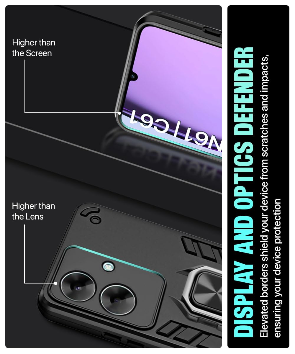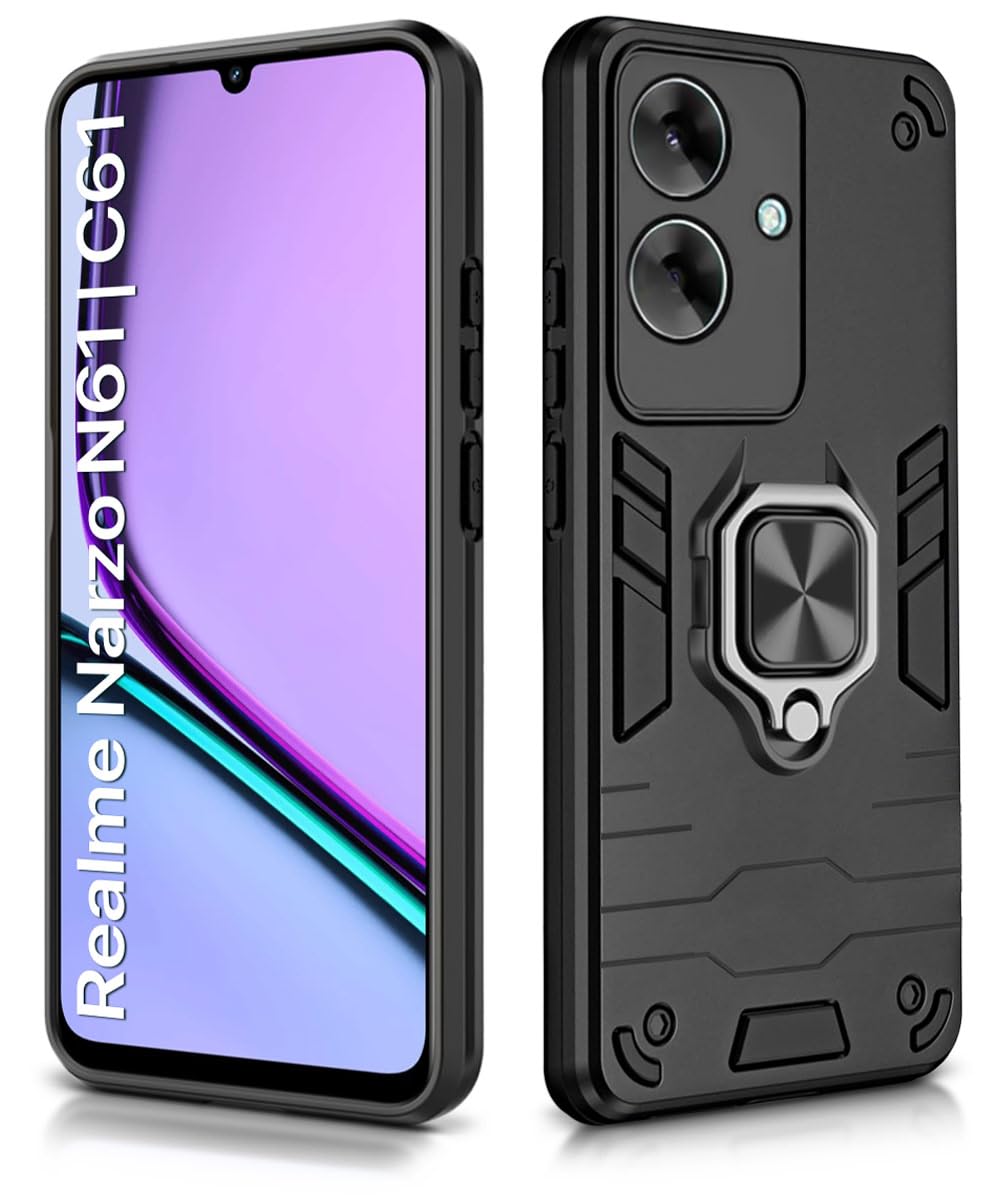 Shock Proof Back Case Mobile Cover for Realme Narzo N61 | Realme C61 (Tough Armor | Hybrid PC + TPU | Full Protection with Ring Holder & in-Built Kickstand | Black)