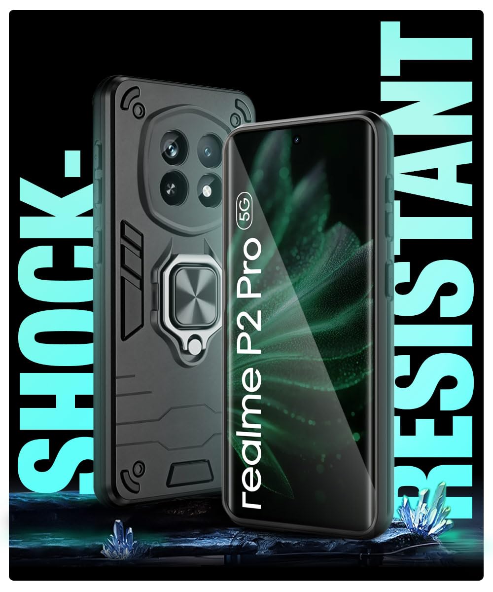 Shock Proof Back Case Mobile Cover for Realme P2 Pro 5G | Back Cover Case (Tough Armor | Hybrid PC + TPU | Ring Holder & in-Built Kickstand | Black)