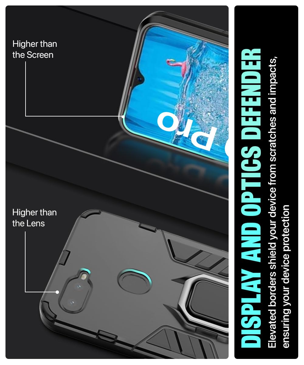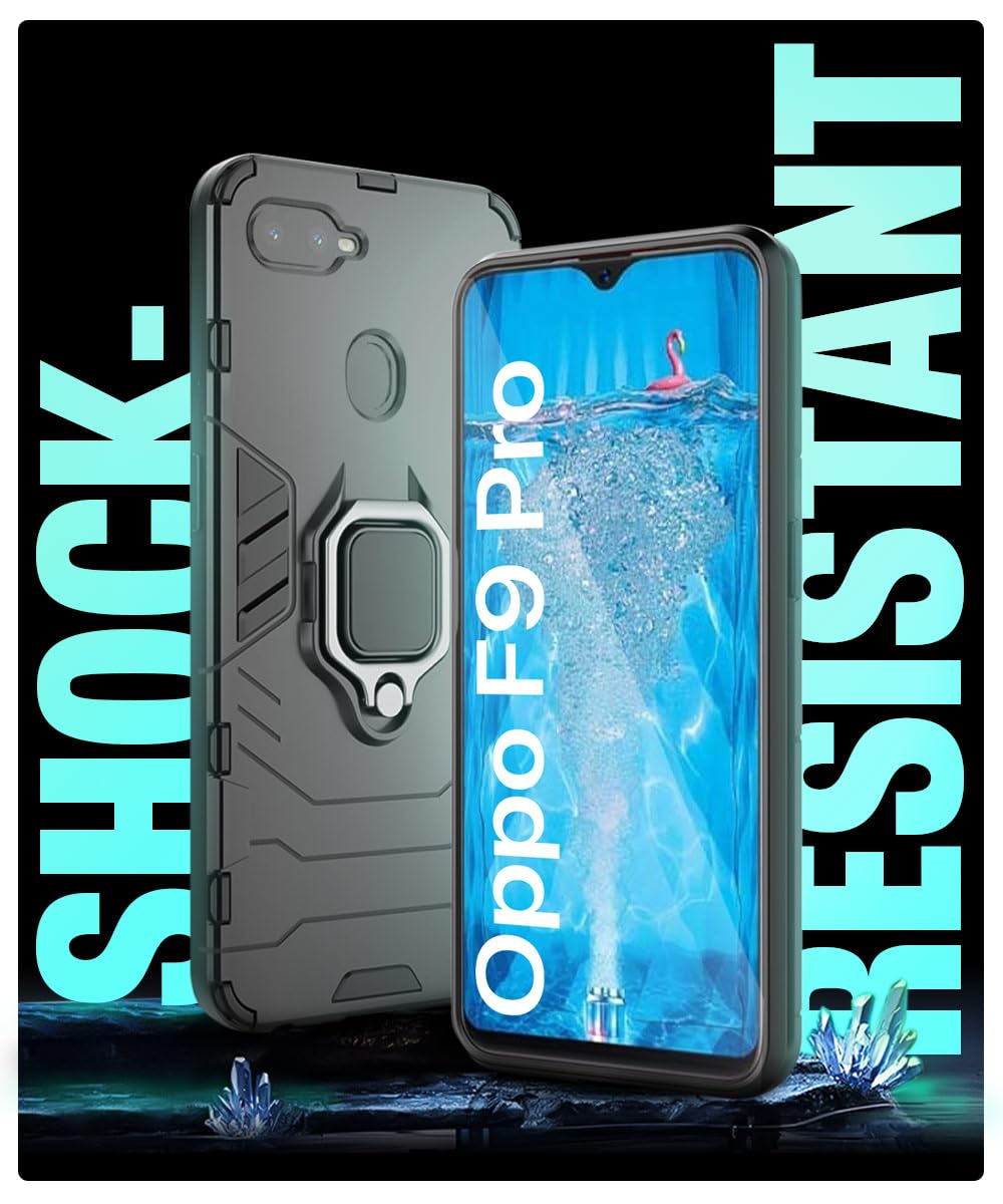 Shock Proof Back Case Mobile Cover for Realme U1 | Oppo F9 Pro (Armor | Hybrid PC + TPU | Full Protection with Ring Holder Kickstand | Carbon Black)