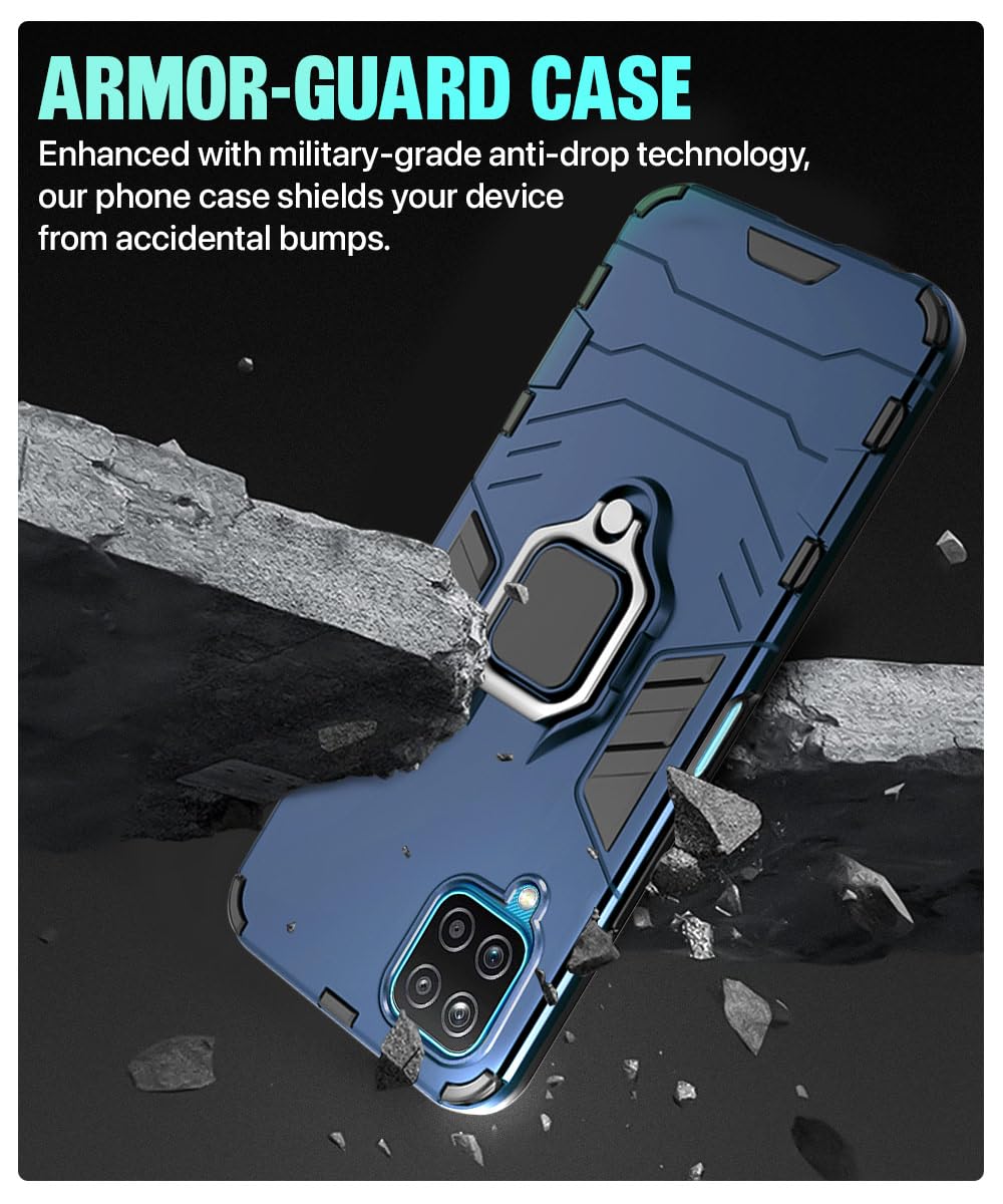 Shock Proof Back Case Mobile Cover for Samsung Galaxy F12 | A12 | M12 | Back Cover Case (Tough Armor | Hybrid PC + TPU | Ring Holder & in-Built Kickstand | Blue)