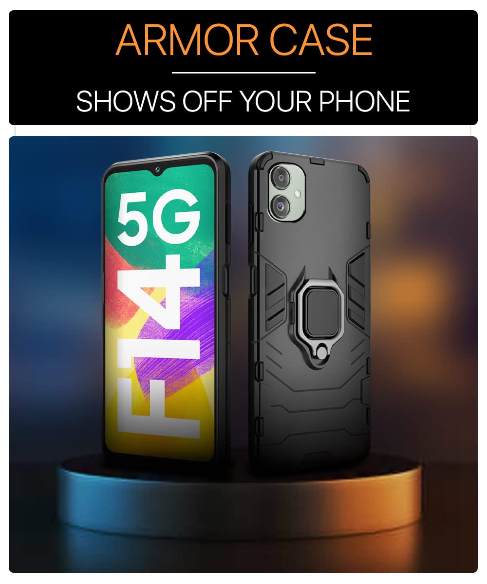 Shock Proof Back Case Mobile Cover for Samsung Galaxy F14 5G | Bumper Back Cover Case (Tough Armor | Hybrid PC + TPU | Full Protection with Ring Holder & in-Built Kickstand | Black)