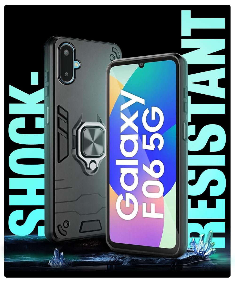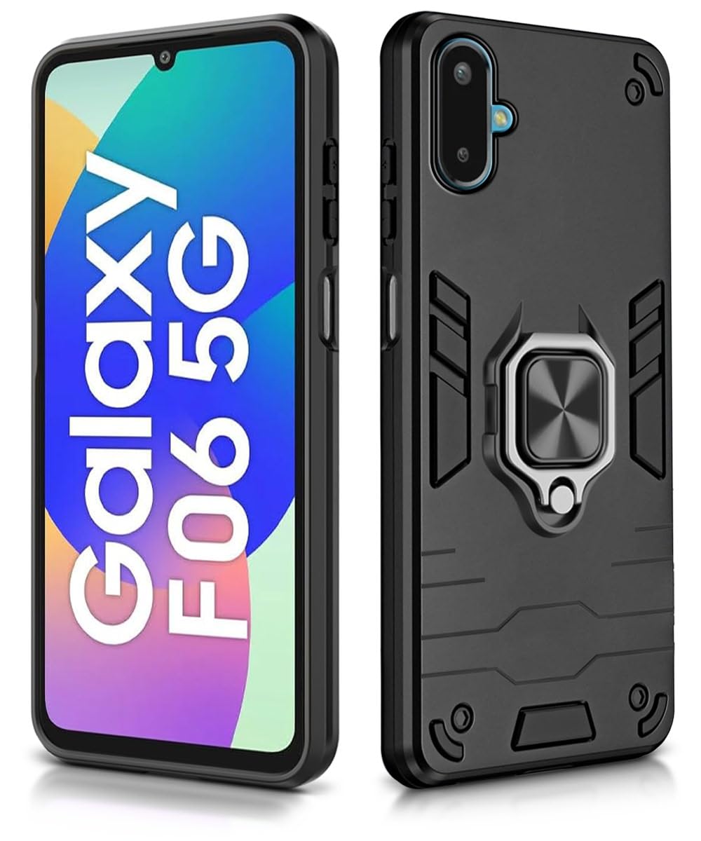 Shock Proof Back Case Mobile Cover for Samsung Galaxy M06 5G | Galaxy F06 5G | Back Cover Case (Tough Armor | Hybrid PC + TPU | Ring Holder & in-Built Kickstand | Black)