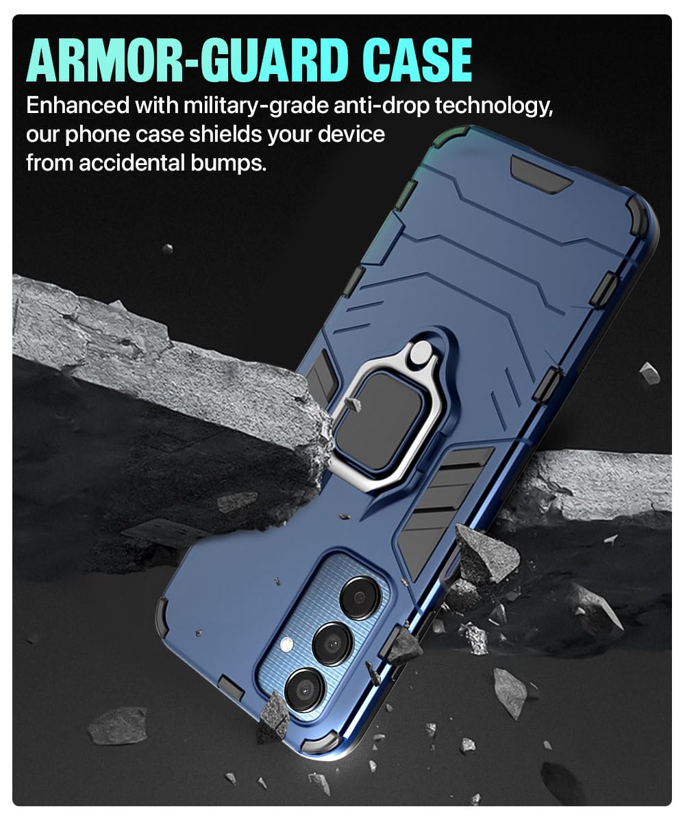 The Shock Proof Back Case Mobile Cover for Samsung Galaxy M15 5G Prime Edition | M15 5G | F15 5G | Back Cover Case (Tough Armor | Hybrid PC + TPU | Ring Holder & in-Built Kickstand | Blue) is designed with premium quality materials to provide superior protection, durability, and style for your smartphone. It offers a perfect balance between functionality and aesthetics, ensuring your device stays safe from scratches, impacts, and daily wear. Engineered with precision, it features accurate cutouts for ports, buttons, and cameras, making it highly convenient for everyday use. The slim and lightweight design ensures that your device retains its sleek profile without adding unnecessary bulk. Whether it is a nano film tempered glass, a hybrid back case, or a camera lens protector, each product is created with attention to detail to enhance the user experience and extend the life of your smartphone. The material used ensures long-lasting clarity, anti-scratch performance, and resistance against fingerprints and smudges. It is the ideal choice for users who want both style and substance in their smartphone accessories. This product from reflects innovation and craftsmanship, making it a reliable accessory that safeguards your investment while maintaining modern appeal.