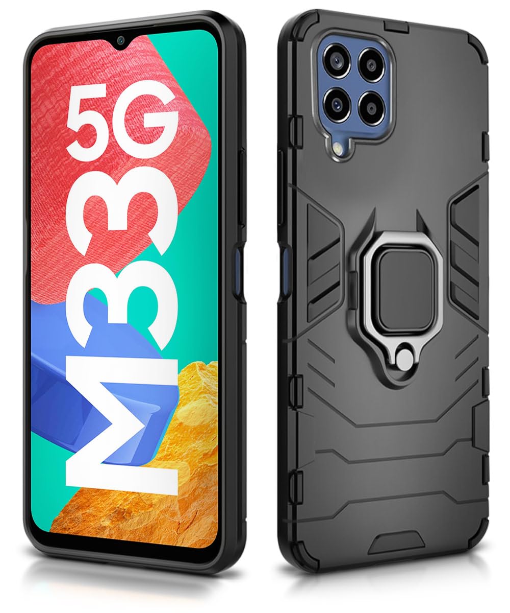 Shock Proof Back Case Mobile Cover for Samsung Galaxy M33 5G | Back Cover Case (Tough Armor | Hybrid PC + TPU | Ring Holder & in-Built Kickstand | Black)