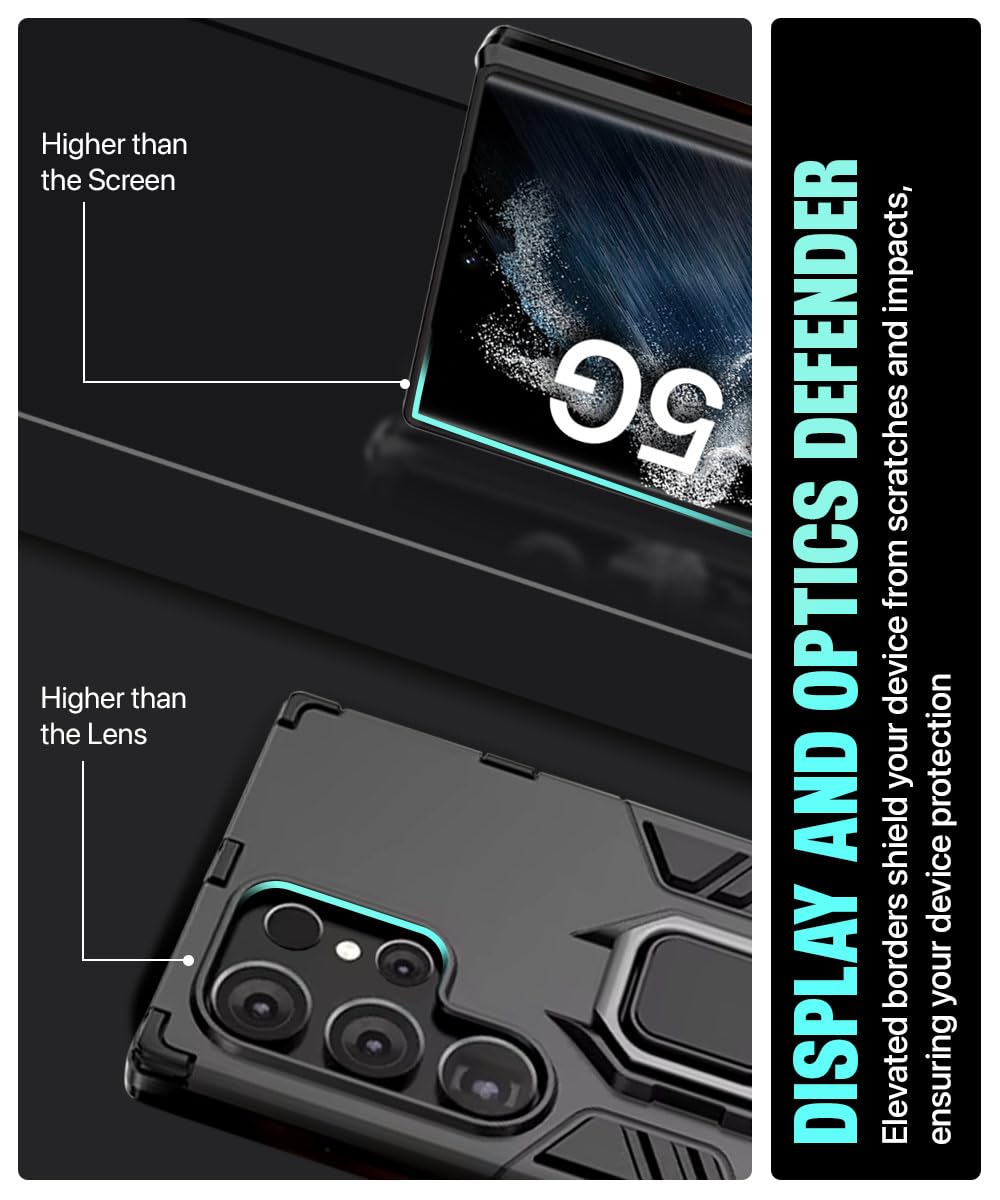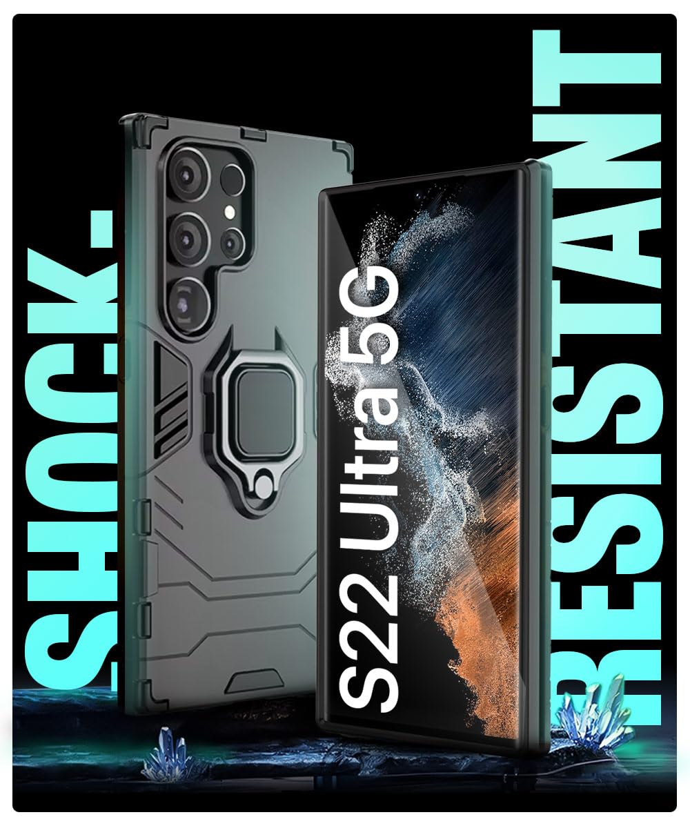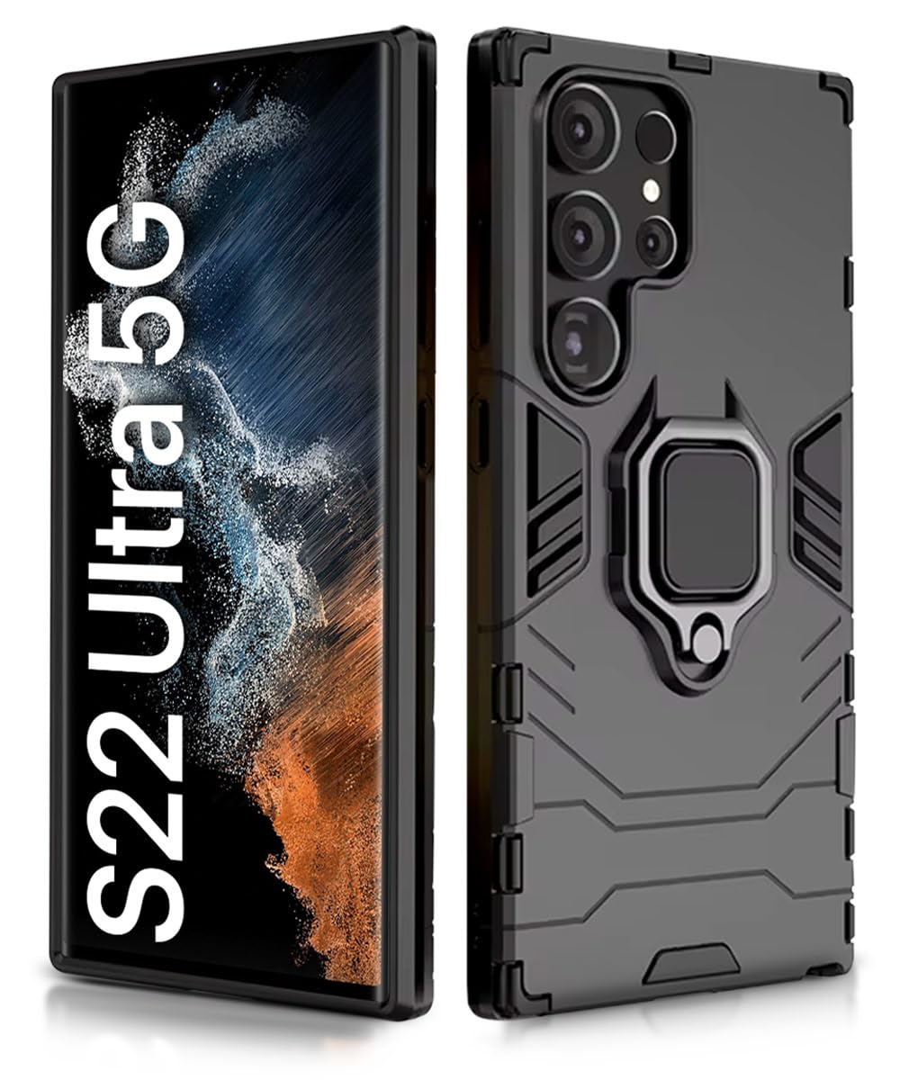 Shock Proof Back Case Mobile Cover for Samsung Galaxy S22 Ultra 5G | Back Cover Case (Tough Armor | Hybrid PC + TPU | Ring Holder & in-Built Kickstand | Black)