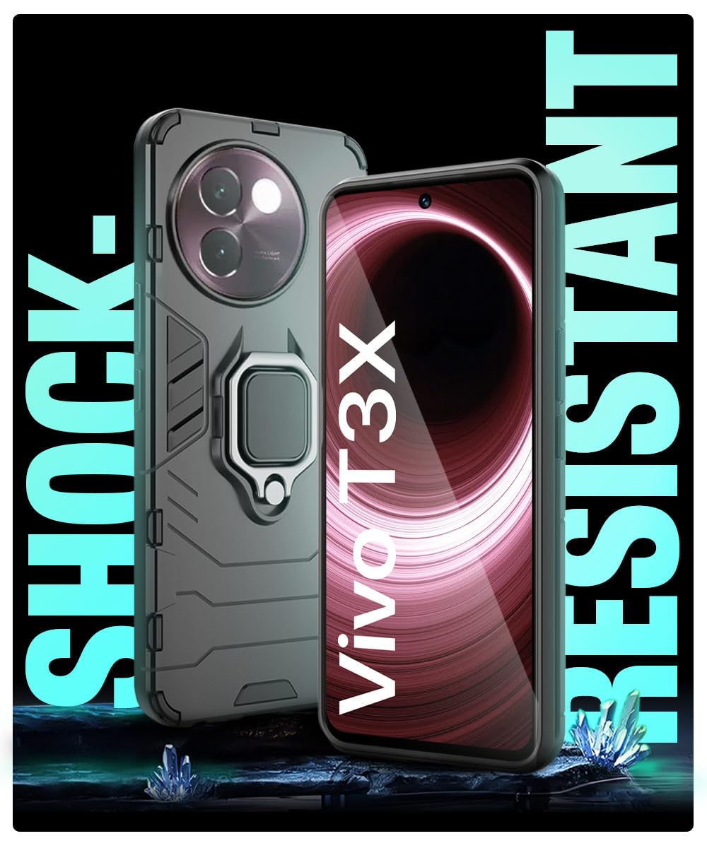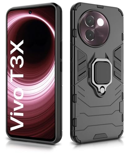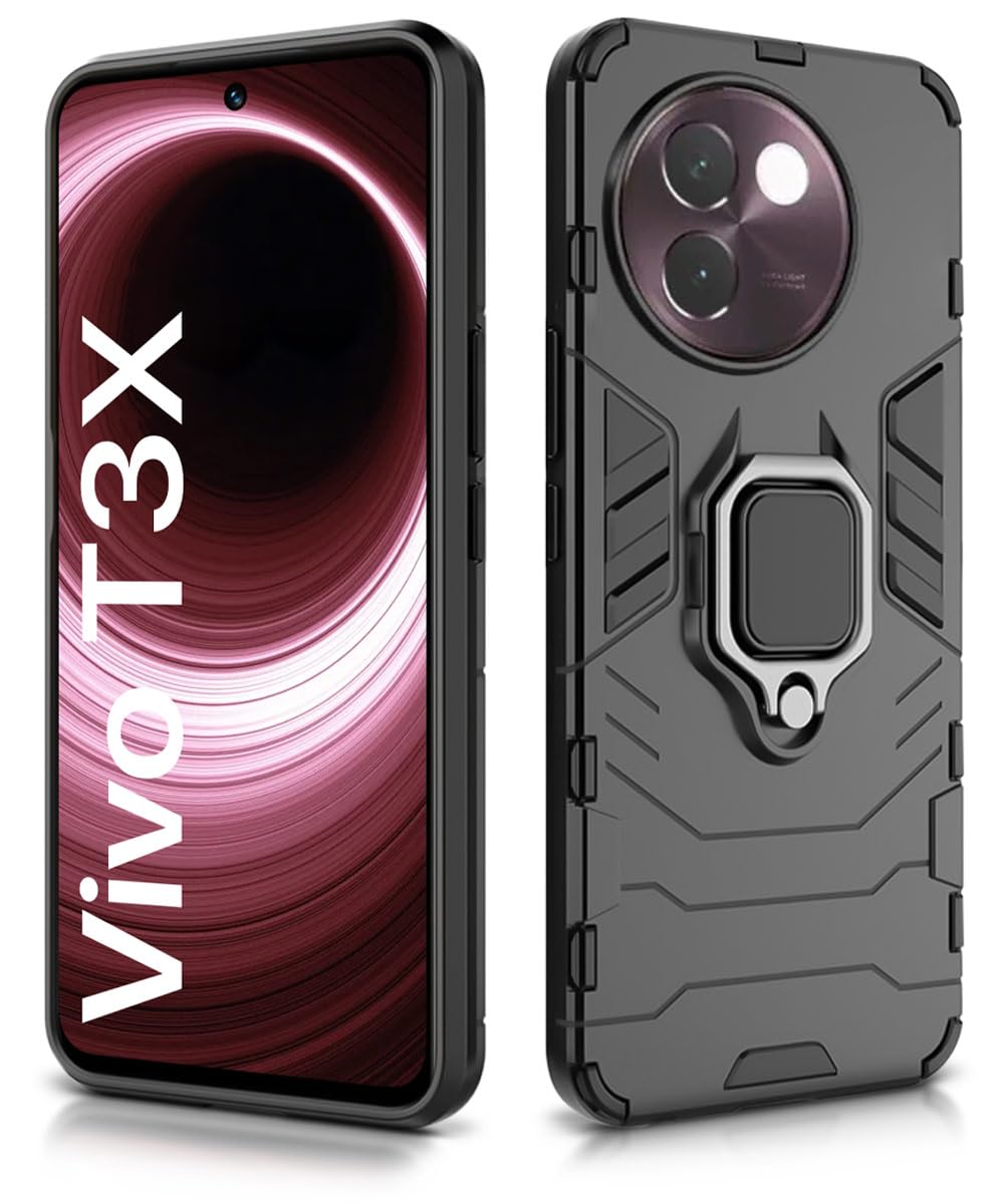 Shock Proof Back Case Mobile Cover for Vivo T3x 5G | Back Cover Case (Tough Armor | Hybrid PC + TPU | Ring Holder & in-Built Kickstand | Black)