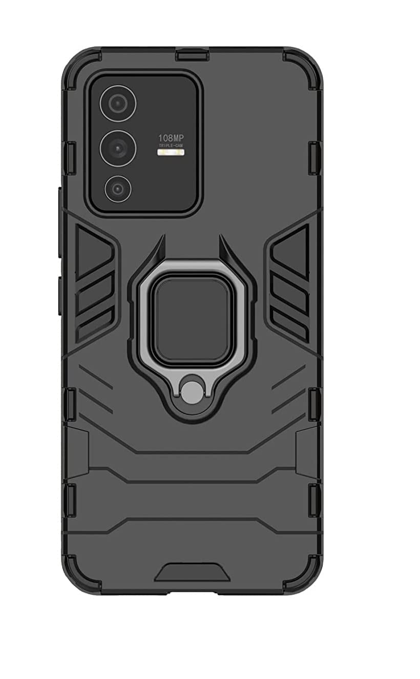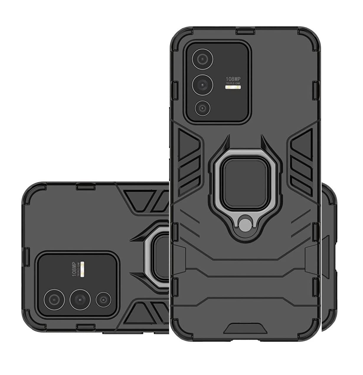 Shock Proof Back Case Mobile Cover for Vivo V23 | Back Cover Case (Tough Armor | Hybrid PC + TPU | Ring Holder & in-Built Kickstand | Black)