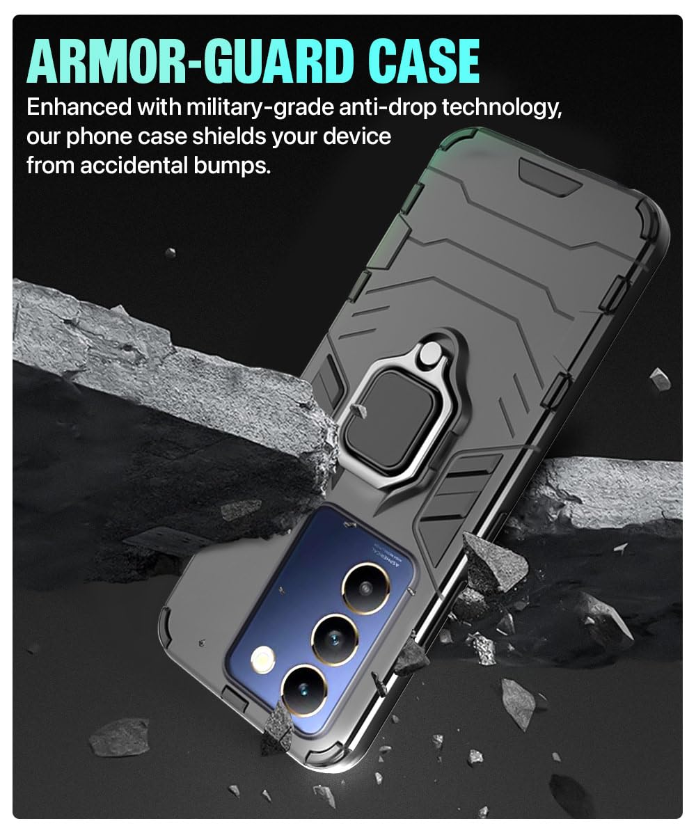 Shock Proof Back Case Mobile Cover for Vivo Y200e 5G | Vivo T3 5G | Back Cover Case (Tough Armor | Hybrid PC + TPU | Ring Holder & in-Built Kickstand | Black)