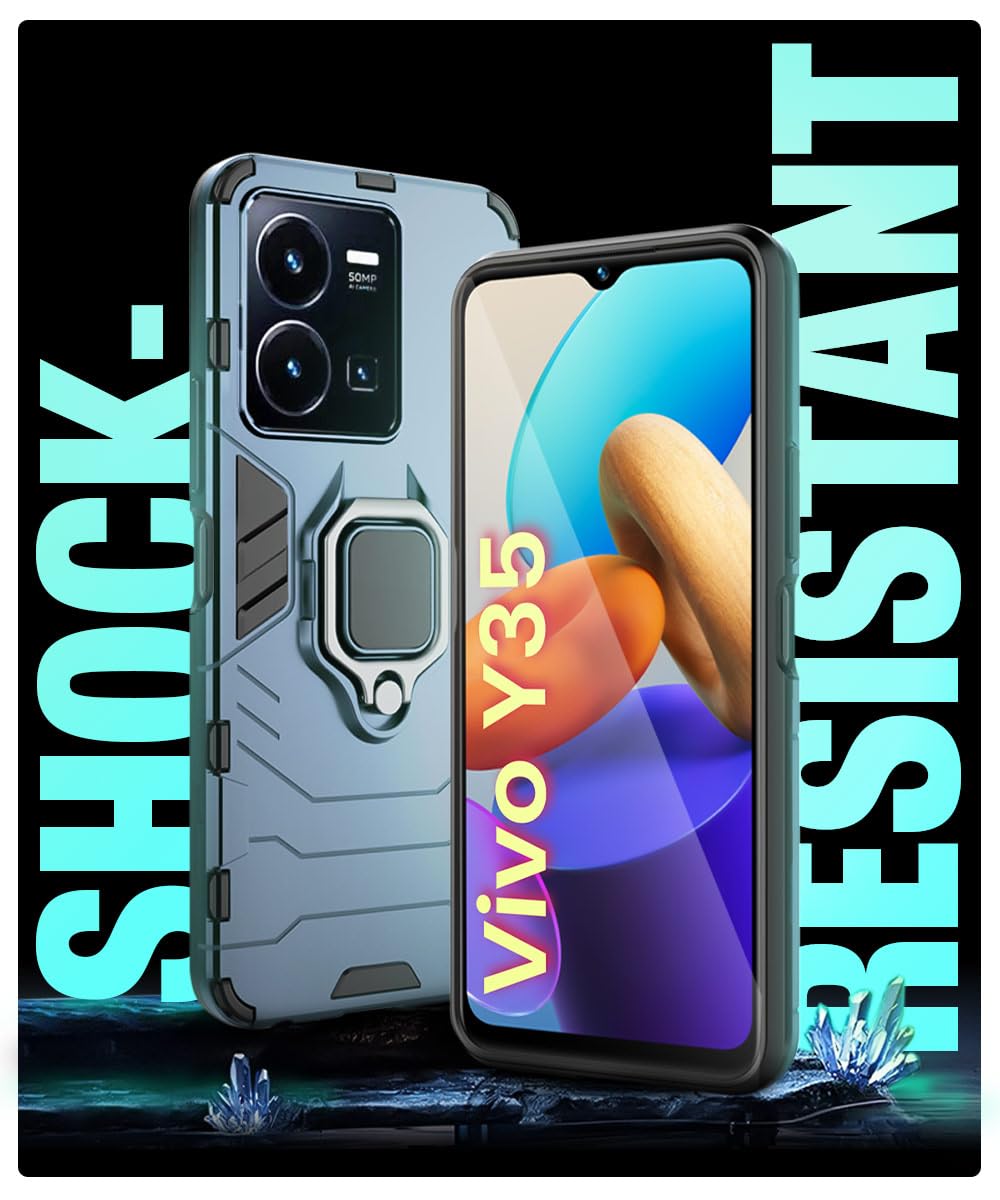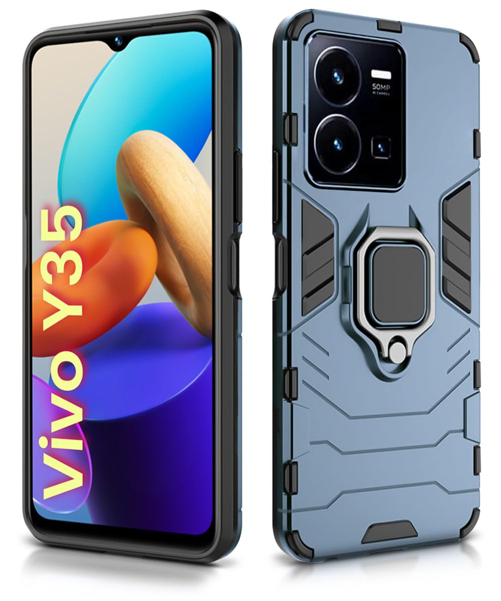 Shock Proof Back Case Mobile Cover for Vivo Y35 | Back Cover Case (Tough Armor | Hybrid PC + TPU | Ring Holder & in-Built Kickstand | Blue)