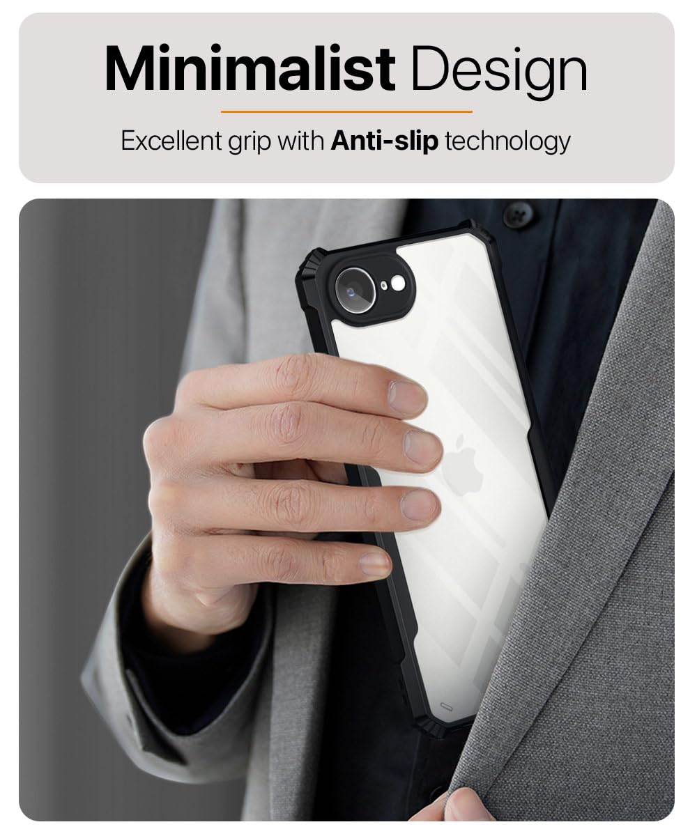 The Shock Proof Clear Protective Back Case for iPhone 16e – AirEDGE Technology | 360 Degree Camera Protection | Transparent Hybrid Back Case Mobile Cover – Black is designed with premium quality materials to provide superior protection, durability, and style for your smartphone. It offers a perfect balance between functionality and aesthetics, ensuring your device stays safe from scratches, impacts, and daily wear. Engineered with precision, it features accurate cutouts for ports, buttons, and cameras, making it highly convenient for everyday use. The slim and lightweight design ensures that your device retains its sleek profile without adding unnecessary bulk. Whether it is a nano film tempered glass, a hybrid back case, or a camera lens protector, each product is created with attention to detail to enhance the user experience and extend the life of your smartphone. The material used ensures long-lasting clarity, anti-scratch performance, and resistance against fingerprints and smudges. It is the ideal choice for users who want both style and substance in their smartphone accessories. This product from reflects innovation and craftsmanship, making it a reliable accessory that safeguards your investment while maintaining modern appeal.