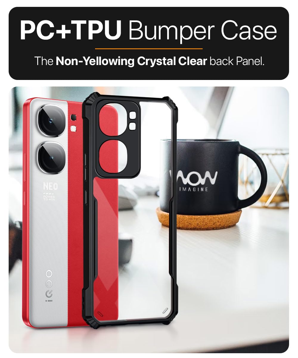 Shock Proof Clear Protective Back Case for iQOO Neo 9 Pro 5G AirEDGE Technology | 360 Degree Camera Protection | Transparent Hybrid Back Case Mobile Cover Black is designed with premium quality materials to provide superior protection, durability, and style for your smartphone. It offers a perfect balance between functionality and aesthetics, ensuring your device stays safe from scratches, impacts, and daily wear. Engineered with precision, it features accurate cutouts for ports, buttons, and cameras, making it highly convenient for everyday use. The slim and lightweight design ensures that your device retains its sleek profile without adding unnecessary bulk. Whether it is a nano film tempered glass, a hybrid back case, or a camera lens protector, each product is created with attention to detail to enhance the user experience and extend the life of your smartphone. The material used ensures longlasting clarity, antiscratch performance, and resistance against fingerprints and smudges. It is the ideal choice for users who want both style and substance in their smartphone accessories. This product from reflects innovation and craftsmanship, making it a reliable accessory that safeguards your investment while maintaining modern appeal.