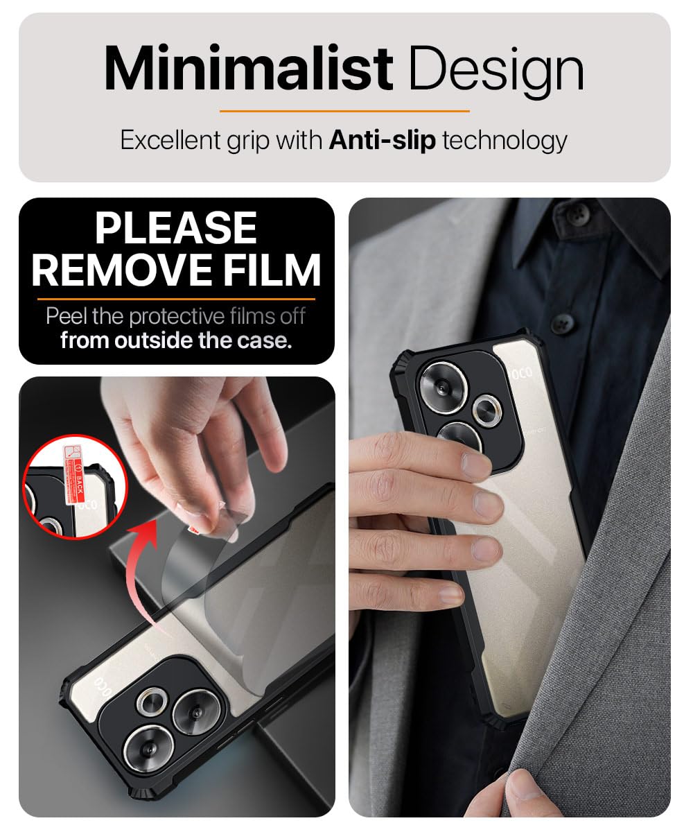 The Shock Proof Clear Protective Back Case for Poco F6 5G – AirEDGE Technology | 360 Degree Camera Protection | Transparent Hybrid Back Case Mobile Cover – Black is designed with premium quality materials to provide superior protection, durability, and style for your smartphone. It offers a perfect balance between functionality and aesthetics, ensuring your device stays safe from scratches, impacts, and daily wear. Engineered with precision, it features accurate cutouts for ports, buttons, and cameras, making it highly convenient for everyday use. The slim and lightweight design ensures that your device retains its sleek profile without adding unnecessary bulk. Whether it is a nano film tempered glass, a hybrid back case, or a camera lens protector, each product is created with attention to detail to enhance the user experience and extend the life of your smartphone. The material used ensures long-lasting clarity, anti-scratch performance, and resistance against fingerprints and smudges. It is the ideal choice for users who want both style and substance in their smartphone accessories. This product from reflects innovation and craftsmanship, making it a reliable accessory that safeguards your investment while maintaining modern appeal.