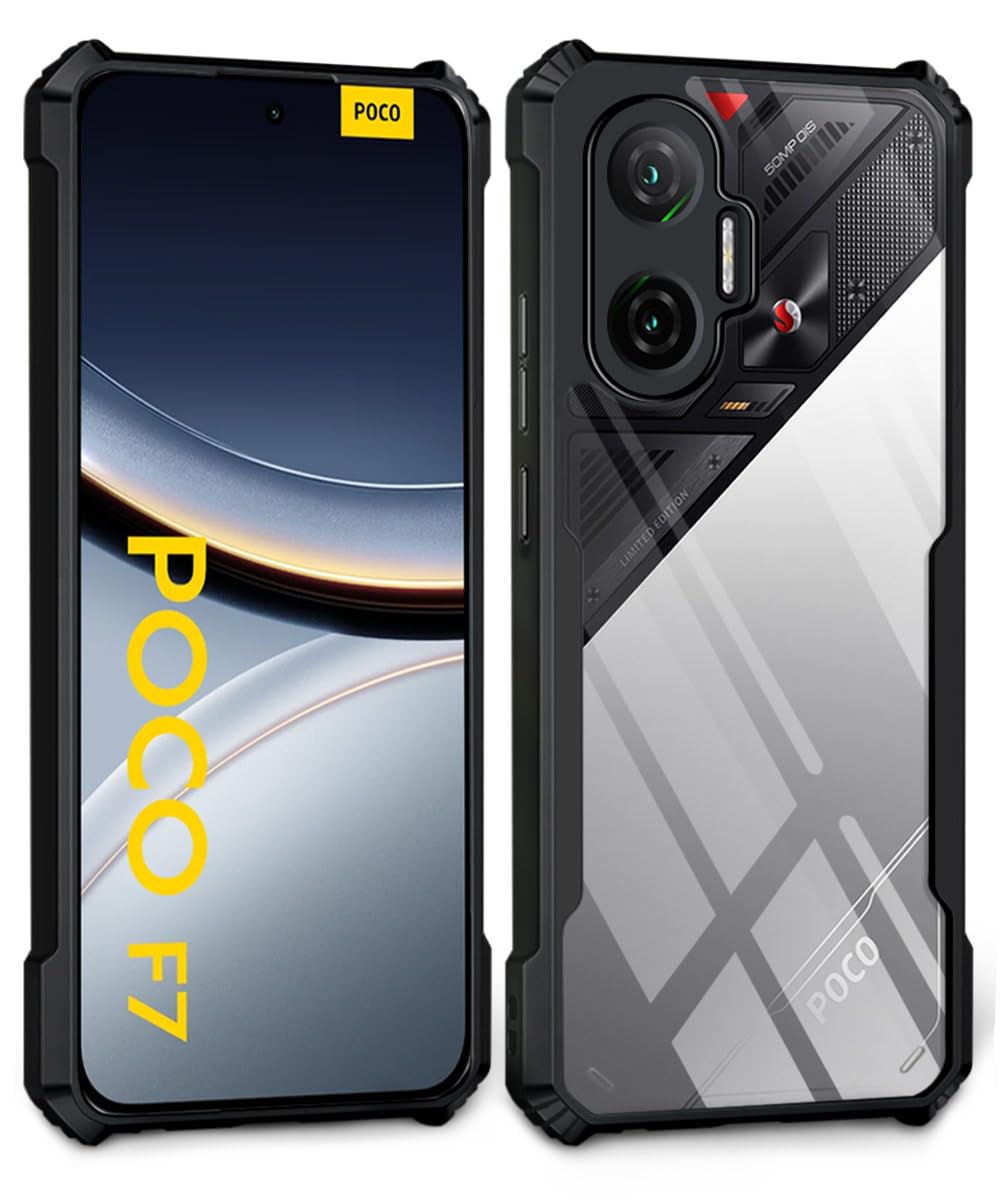 Shock Proof Clear Protective Back Case for Poco F7 5G – AirEDGE Technology | 360 Degree Camera Protection | Transparent Hybrid Back Case Mobile Cover – Black