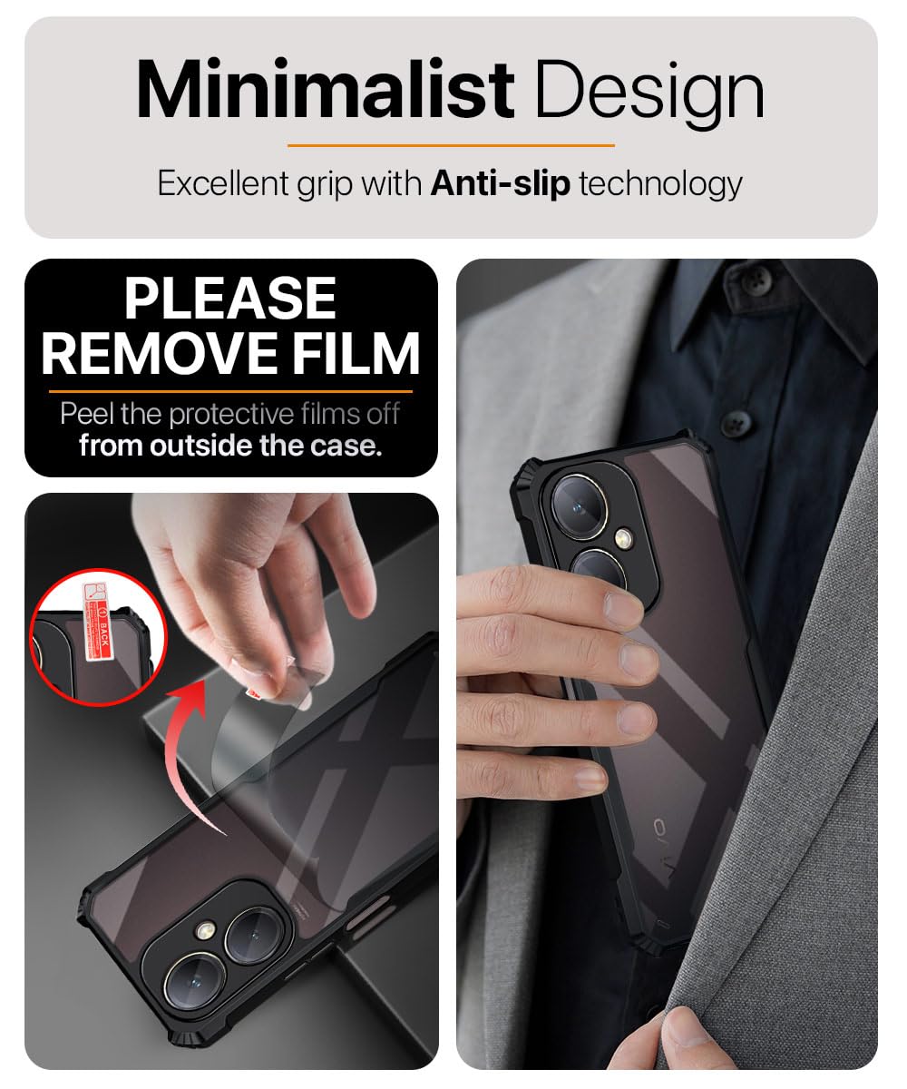 The Shock Proof Clear Protective Back Case for Vivo Y27 4G – AirEDGE Technology | 360 Degree Camera Protection | Transparent Hybrid Back Case Mobile Cover – Black is designed with premium quality materials to provide superior protection, durability, and style for your smartphone. It offers a perfect balance between functionality and aesthetics, ensuring your device stays safe from scratches, impacts, and daily wear. Engineered with precision, it features accurate cutouts for ports, buttons, and cameras, making it highly convenient for everyday use. The slim and lightweight design ensures that your device retains its sleek profile without adding unnecessary bulk. Whether it is a nano film tempered glass, a hybrid back case, or a camera lens protector, each product is created with attention to detail to enhance the user experience and extend the life of your smartphone. The material used ensures long-lasting clarity, anti-scratch performance, and resistance against fingerprints and smudges. It is the ideal choice for users who want both style and substance in their smartphone accessories. This product from reflects innovation and craftsmanship, making it a reliable accessory that safeguards your investment while maintaining modern appeal.