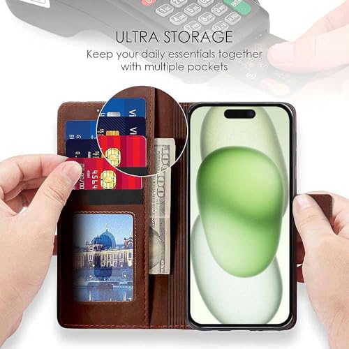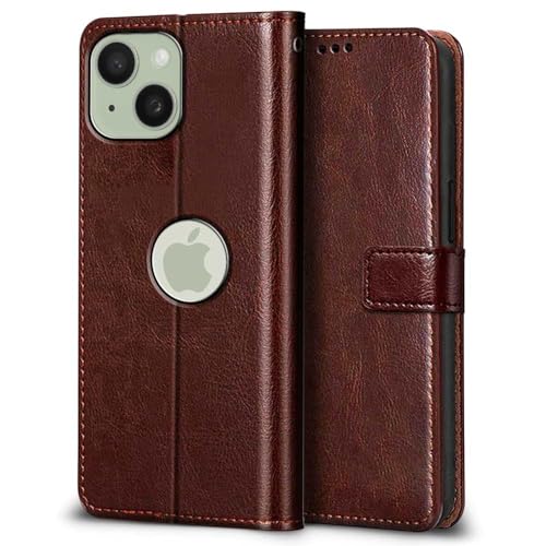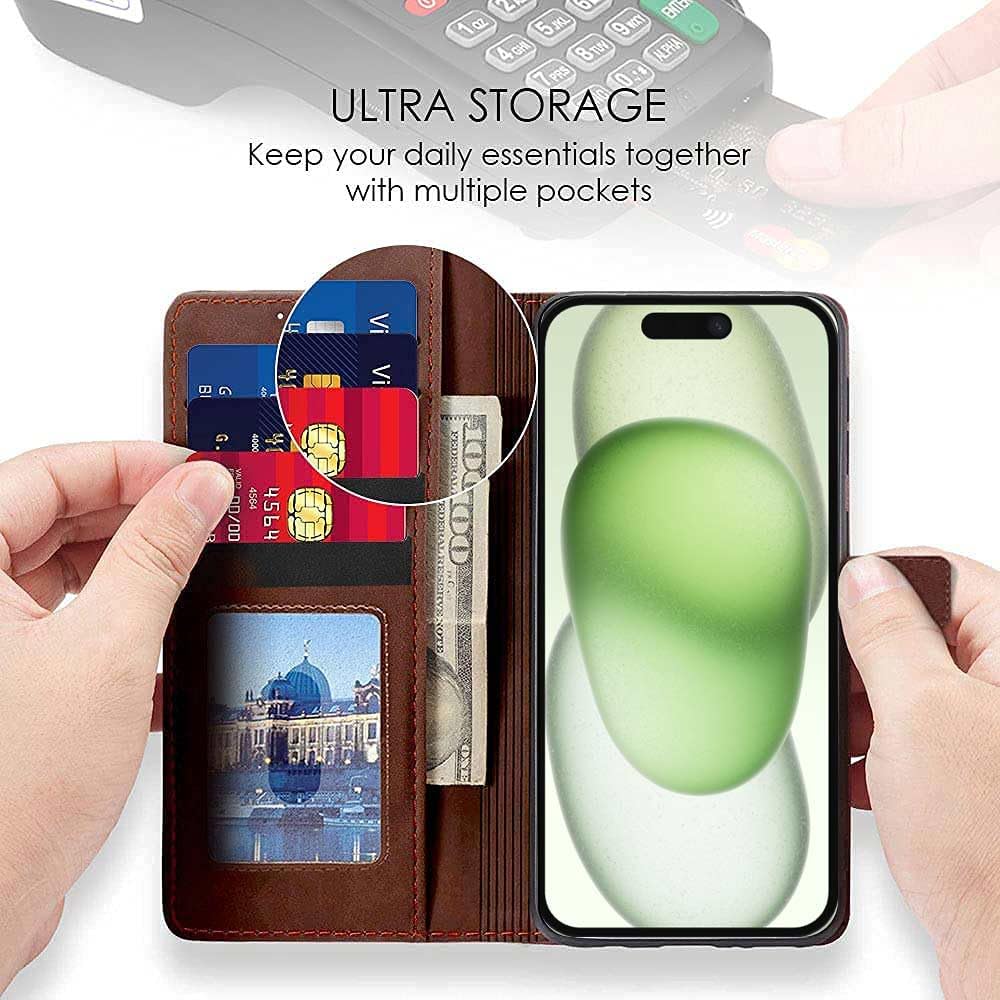 Shock Proof Flip Cover Back Case for Apple Iphone 15 | Magnetic Wallet Leather Case with Stand