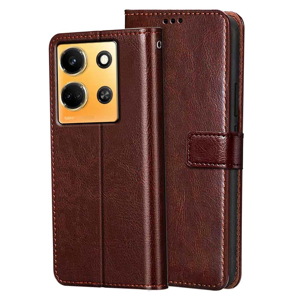 Buy premium shock proof flip cover back case for infinix note 30 5g. Leather finish with magnetic flip closure, wallet pockets and stand support. Durable protection against drops and scratches with a perfect fit for infinix note 30 5g.