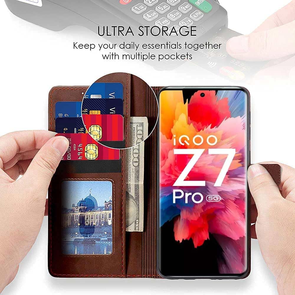 Shock Proof Flip Cover Back Case for Iqoo Z7 Pro | Magnetic Wallet Leather Case with Stand